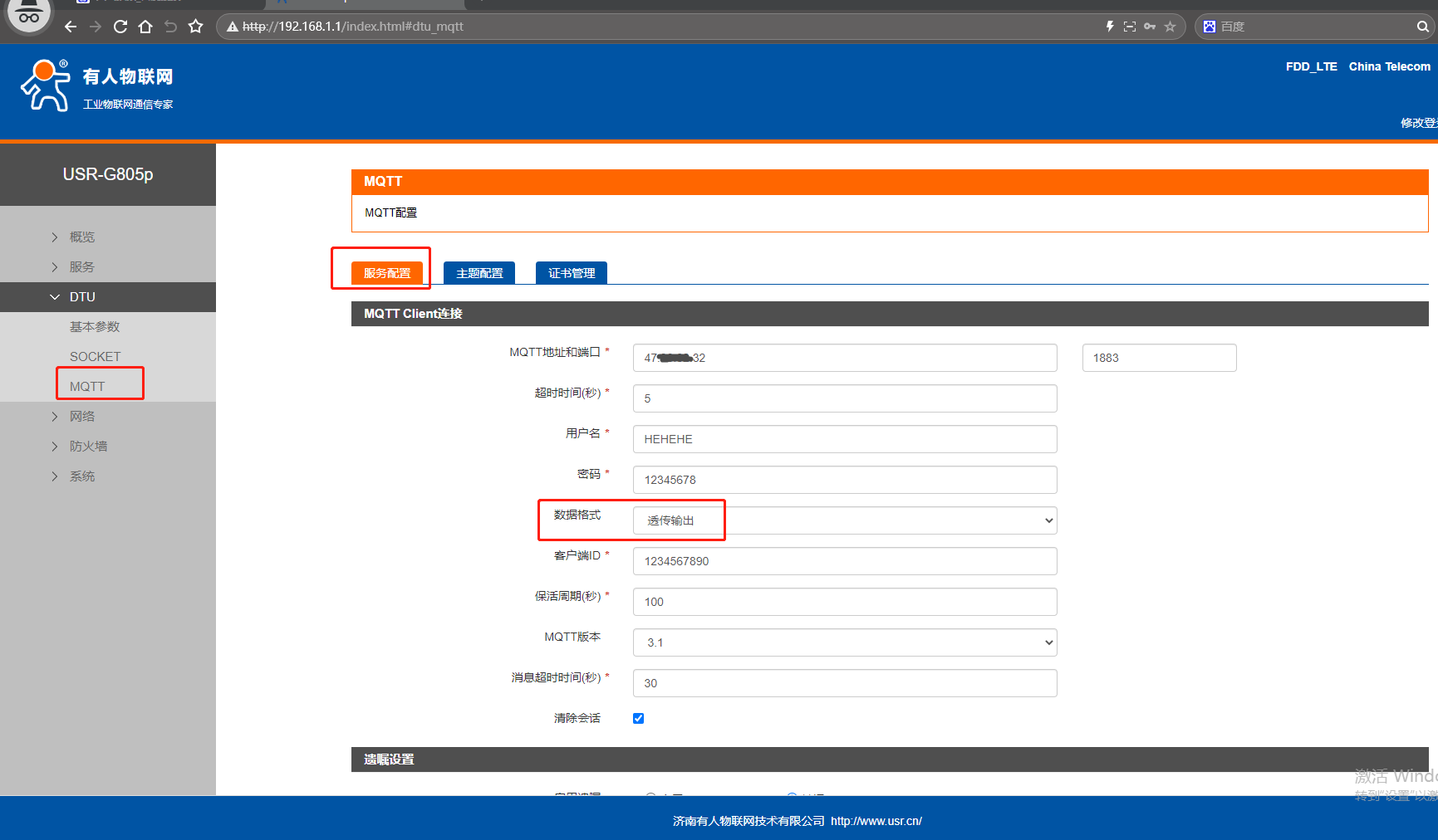 (2)服務器地址填和USR-G805p連接的同一個MQTT服務器地址