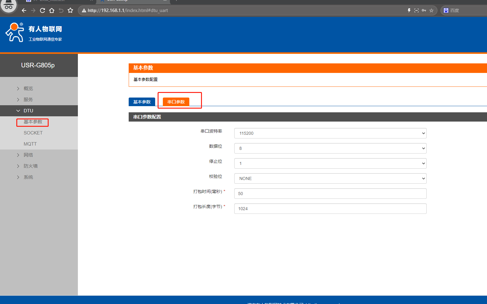 網頁點擊DTU,點擊基本參數,串口參數保持默認,實際應用接實際485串口設備的時候,需要和所接485串口設備的串口參數一致。點擊應用。