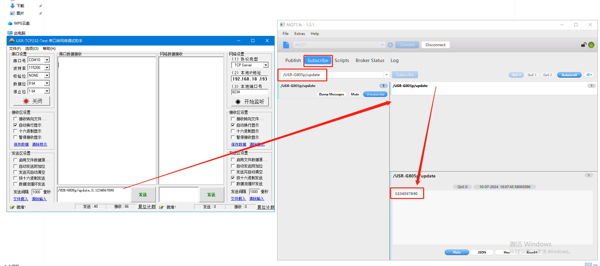 (2)MQTT.fx軟件點擊Subscribe,輸入/USR-G805p/update,點擊后面的Subscribe。串口助手按照格式發送數據,/USR-G805p/update,0,1234567890,MQTT.fx軟件接收到數據1234567890。