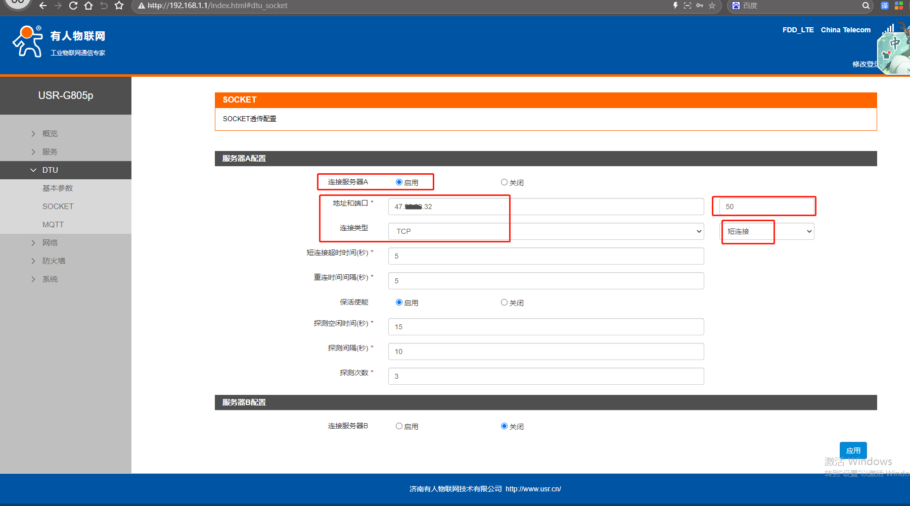 網頁點擊DTU,點擊SOCKET,連接服務器A,點擊啟用,地址填遠程服務器,端口號50,連接類型TCP,短連接。點擊應用。