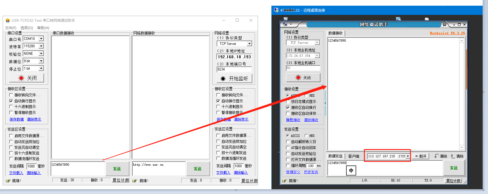 2、打開串口助手,選擇USB-RS485串口線的COM口號,串口參數和USR-G805p一致。測試串口向服務器網絡發送數據,遠程桌面TCP連接建立,串口再發數據,服務器接收到數據。不發送數據,TCP連接會斷開,這就是短連接。