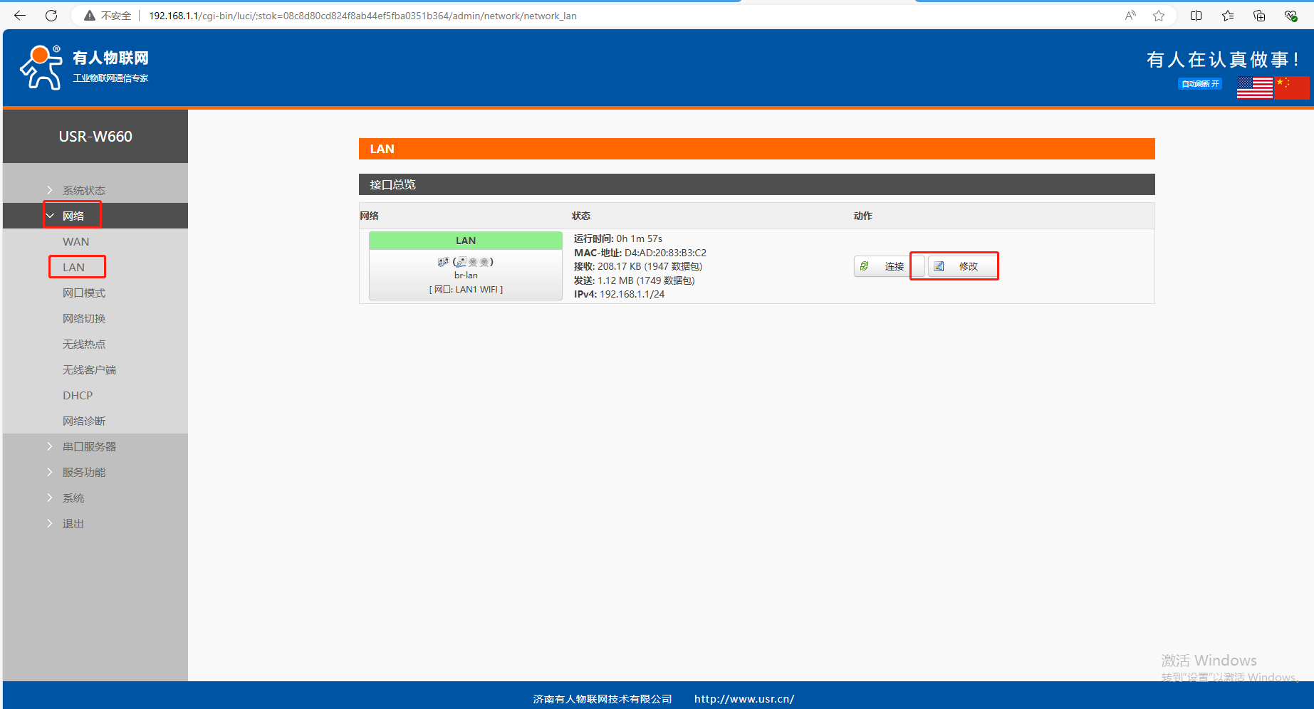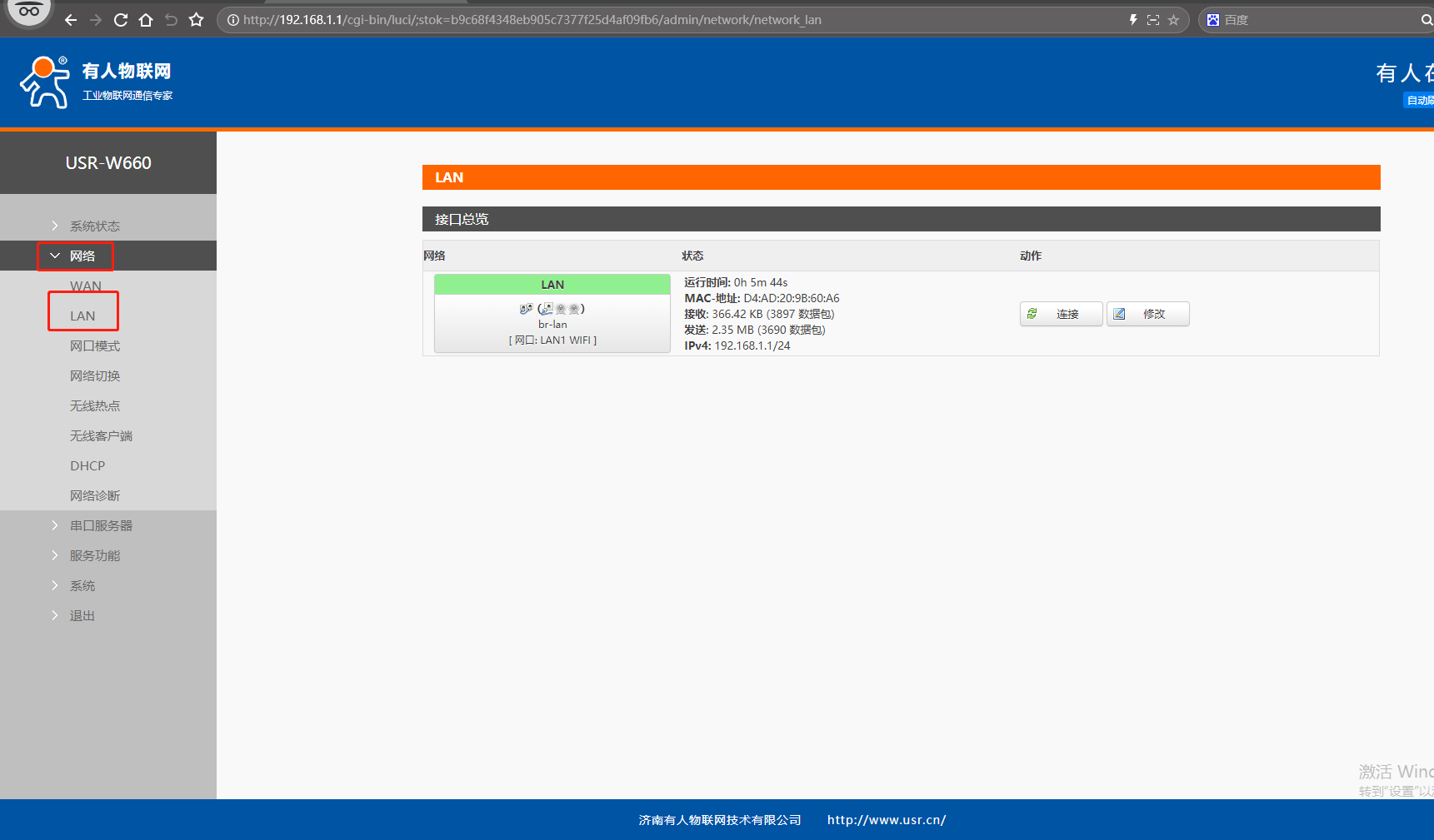 網(wǎng)頁(yè)點(diǎn)開(kāi)網(wǎng)絡(luò),點(diǎn)擊LAN,點(diǎn)擊修改,LAN口的基本設(shè)置,可以查看USR-W660做AP模式的IP是192.168.1.1。也可以根據(jù)現(xiàn)場(chǎng)應(yīng)用實(shí)際修改。