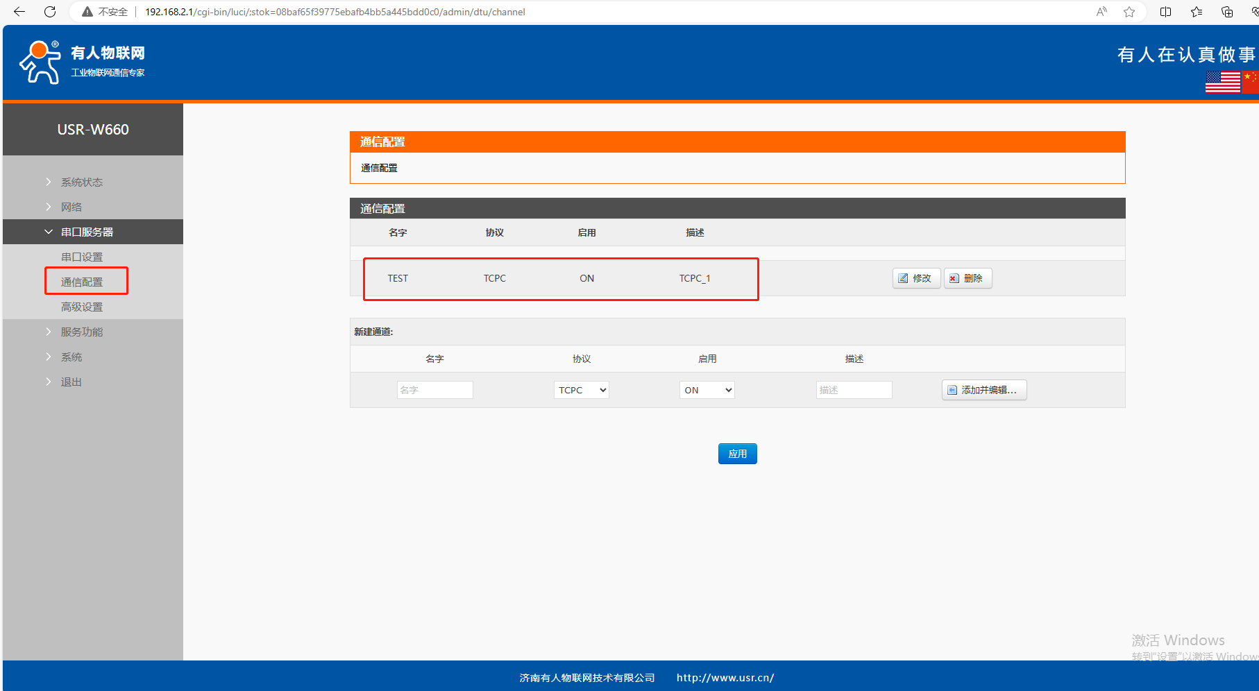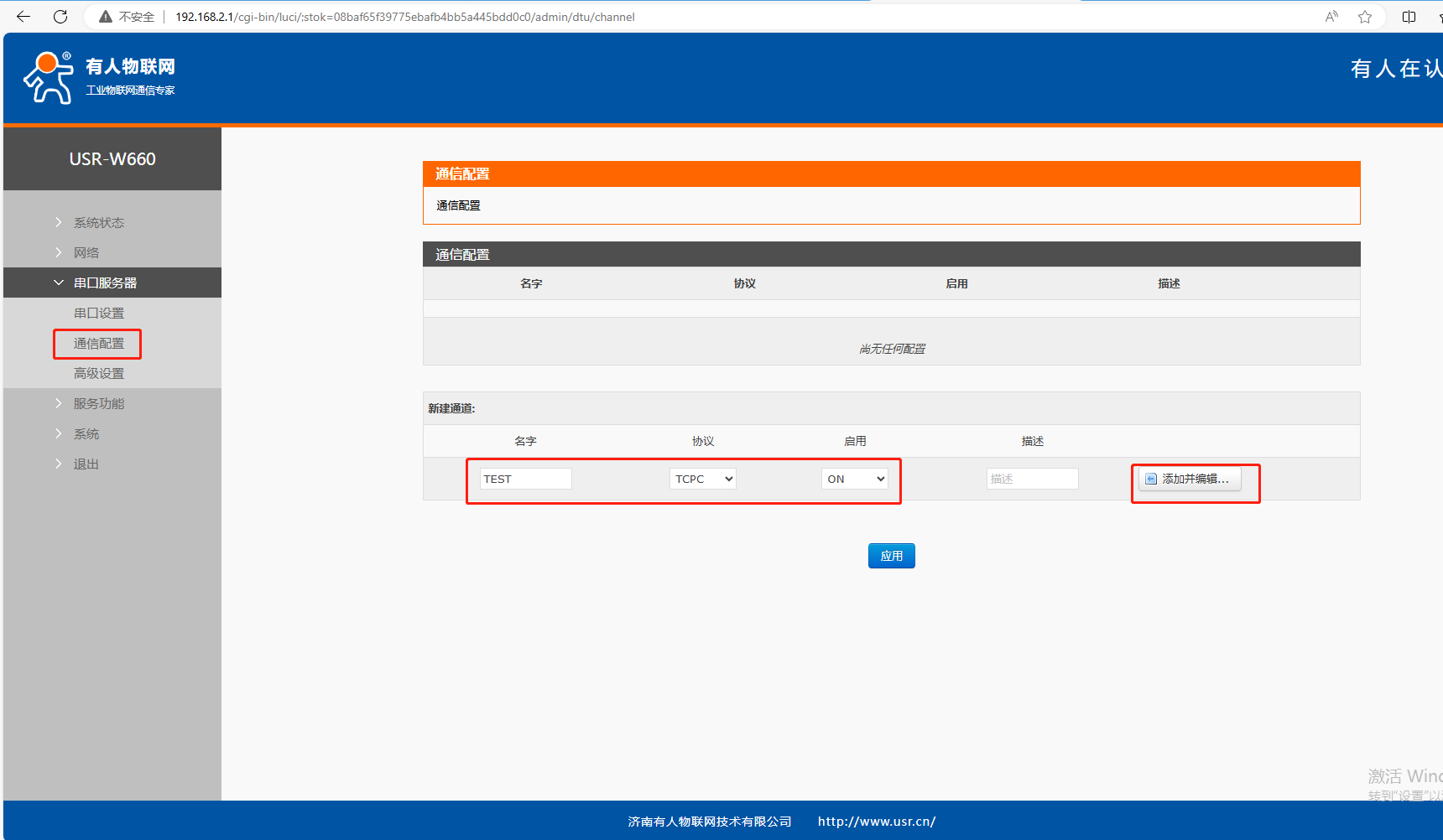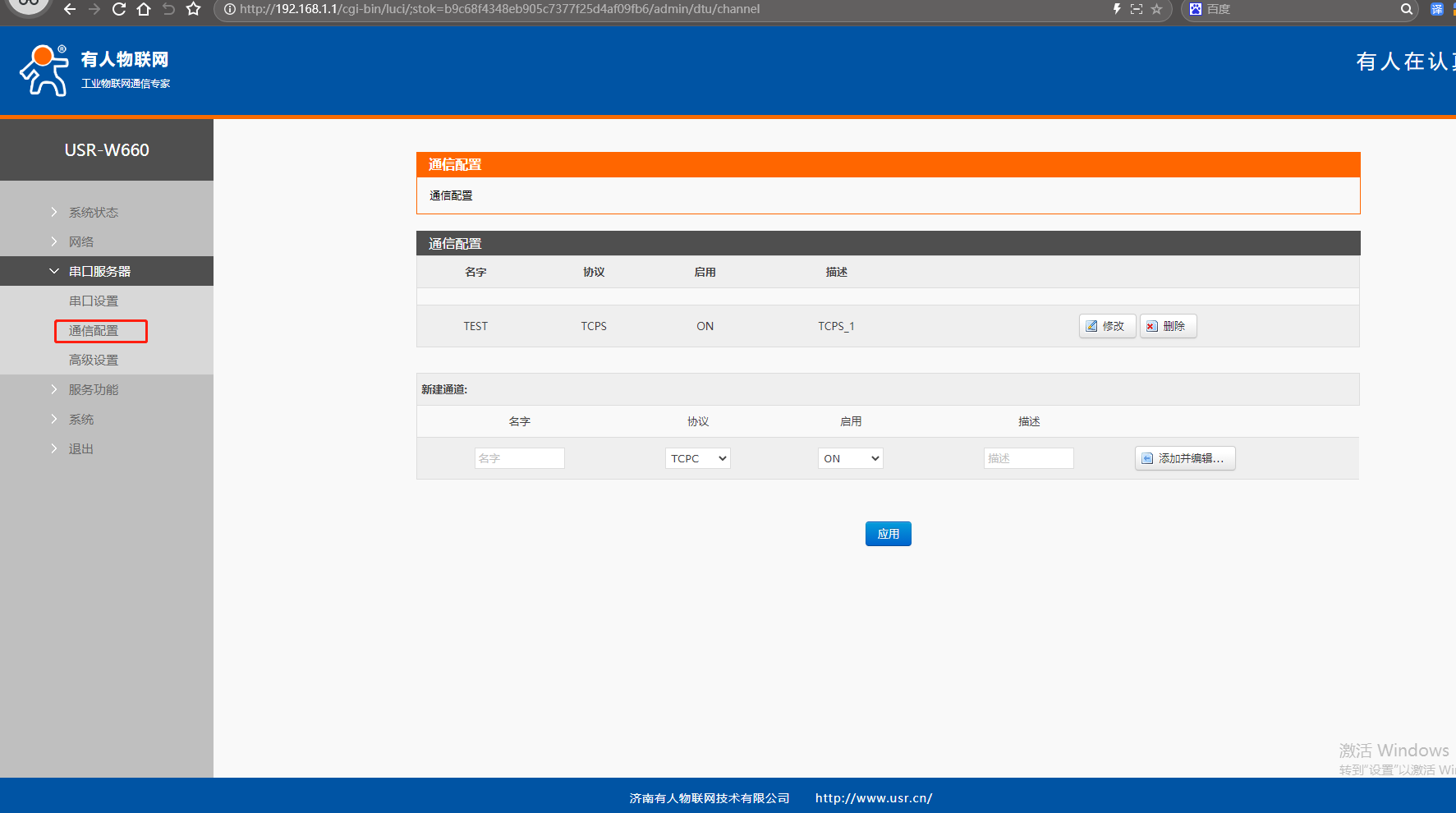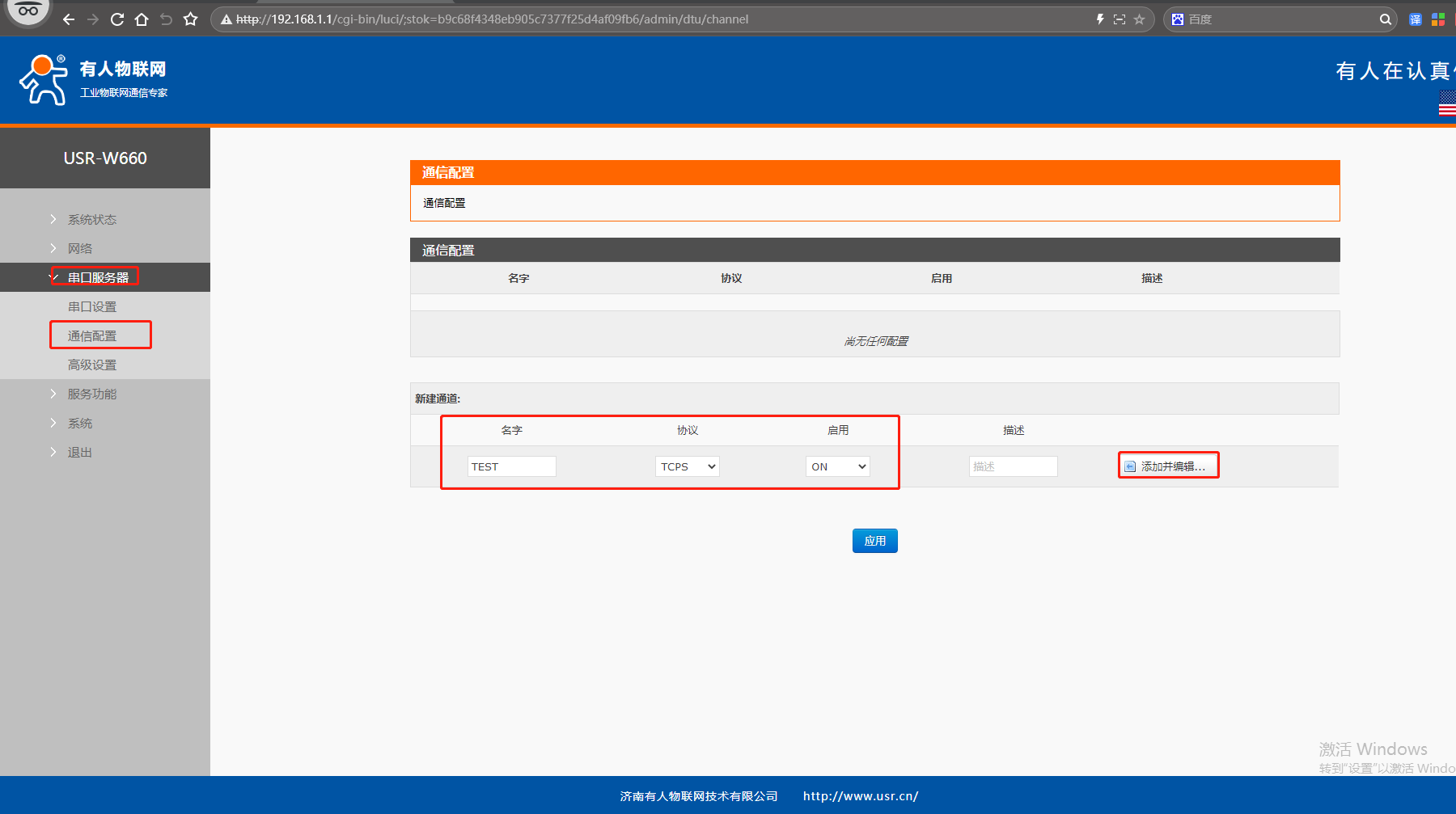 (1)網(wǎng)頁(yè)點(diǎn)開(kāi)串口服務(wù)器,點(diǎn)擊通信配置,USR-W660 AP模式,做TCP server服務(wù)器,網(wǎng)頁(yè)新建通道,名字TEST,協(xié)議TCPS,啟用ON,點(diǎn)擊添加并編輯。