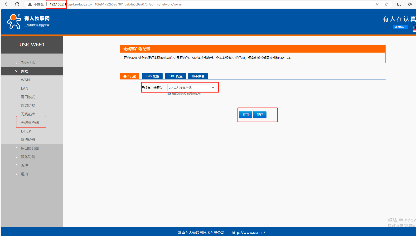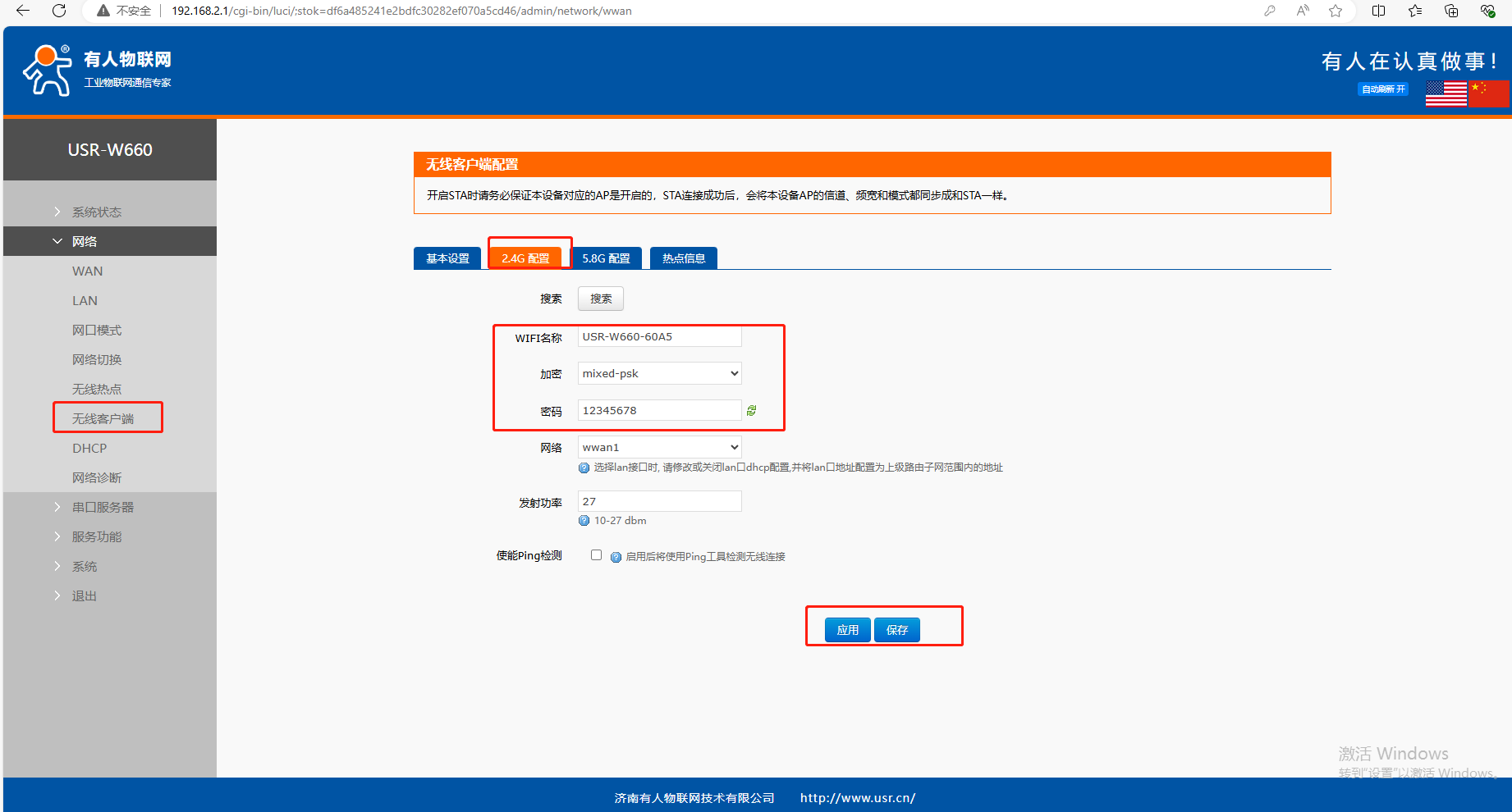 點(diǎn)擊2.4G配置,WiFi名稱(chēng)填要連接的AP WiFi名,USR-W660-60A5,加密選擇mixed-psk,密碼設(shè)置12345678。點(diǎn)擊應(yīng)用、保存。