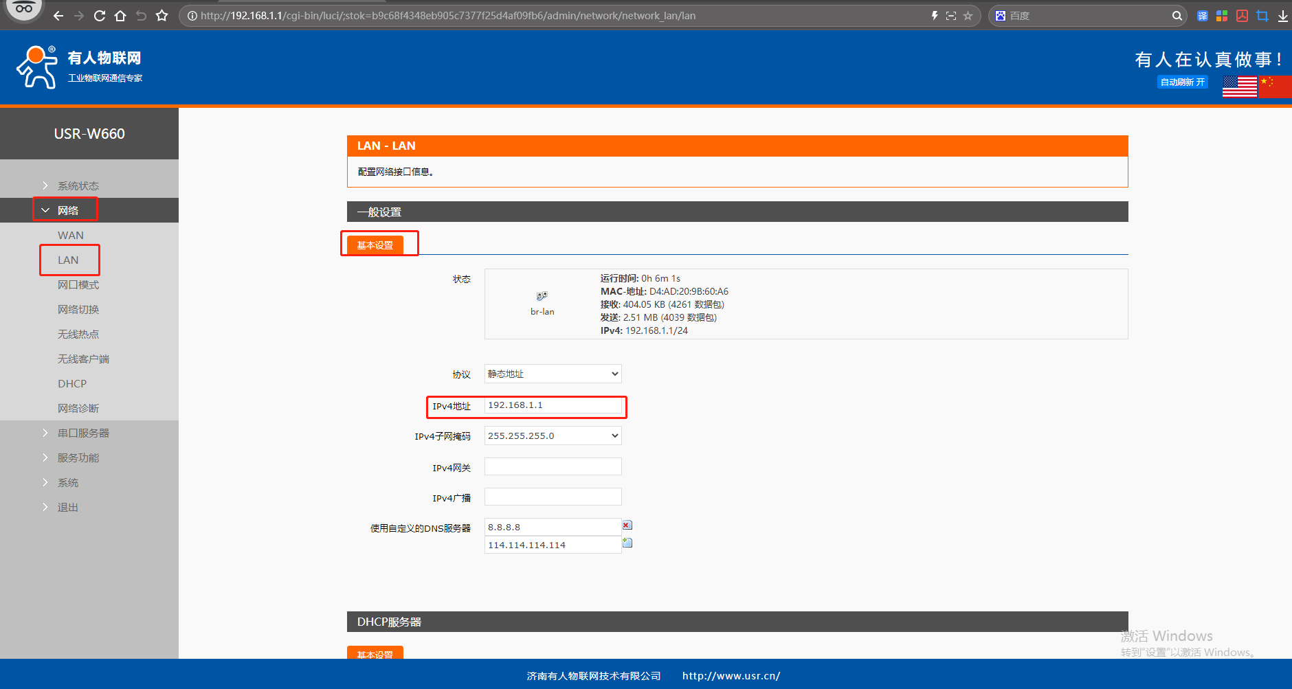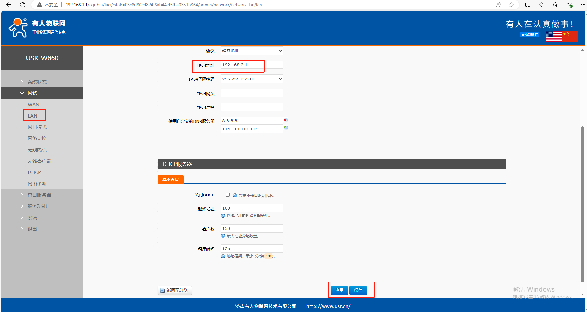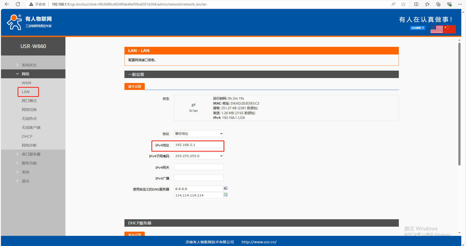 網(wǎng)頁(yè)點(diǎn)開(kāi)網(wǎng)絡(luò),點(diǎn)擊LAN,點(diǎn)擊修改,LAN口的基本設(shè)置,USR-W660做STA模式,IP不要和AP的USR-W660設(shè)置同網(wǎng)段,所以將IP改為其他網(wǎng)段IP 192.168.2.1。