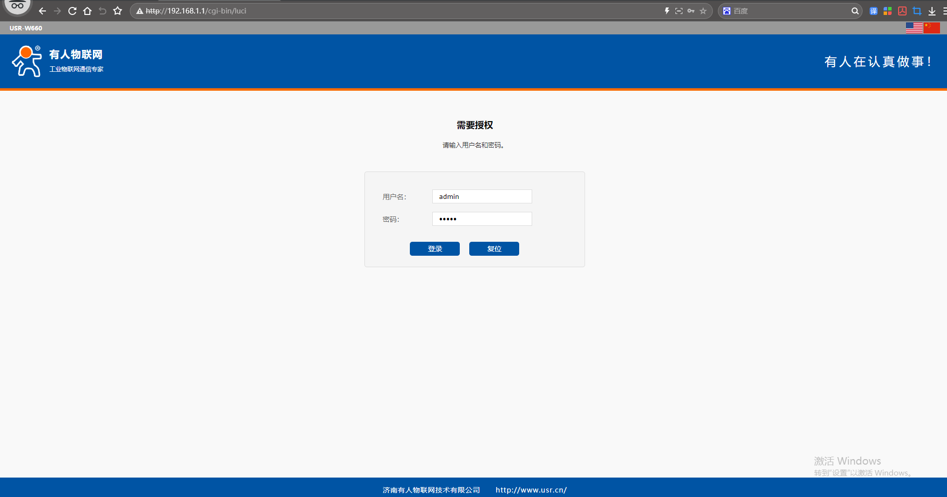 1、電腦無(wú)線網(wǎng)卡,搜索連接2號(hào)USR-W660的WiFi名稱(chēng),USR-W660-B3C1,瀏覽器輸入192.168.1.1登陸W660的網(wǎng)頁(yè)。登陸網(wǎng)頁(yè)的用戶(hù)名和密碼都是admin。