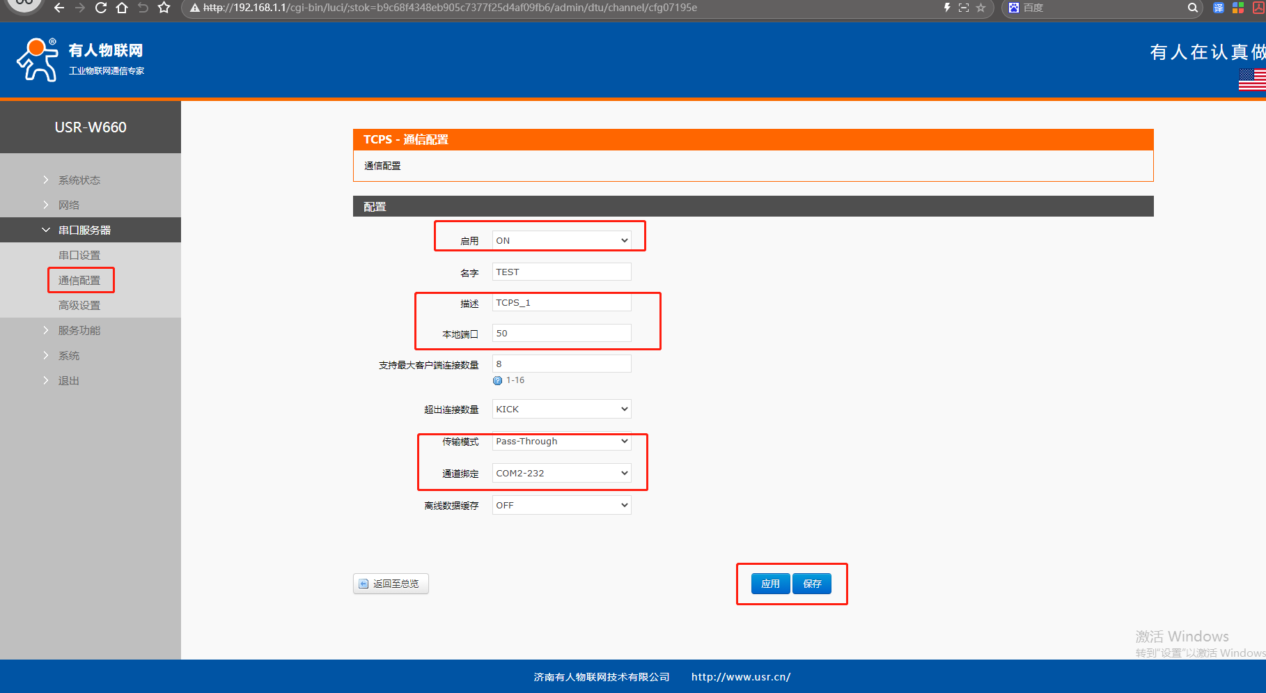 (2)服務(wù)器地址填A(yù)P的USR-W660的IP 192.168.1.1,服務(wù)器端口設(shè)置50,傳輸模式選擇Pass-Through,通道綁定選擇COM2-232。點(diǎn)擊應(yīng)用、保存。