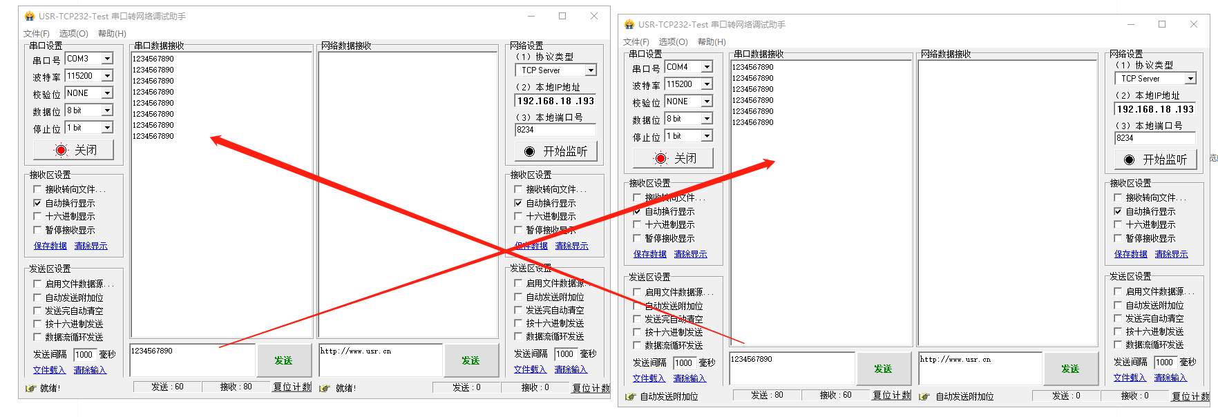 1、打開(kāi)2個(gè)串口助手,分別用2個(gè)USR-W660實(shí)際USB串口COM,COM3、COM4打開(kāi)串口,串口參數(shù)設(shè)置和USR-W660一致。