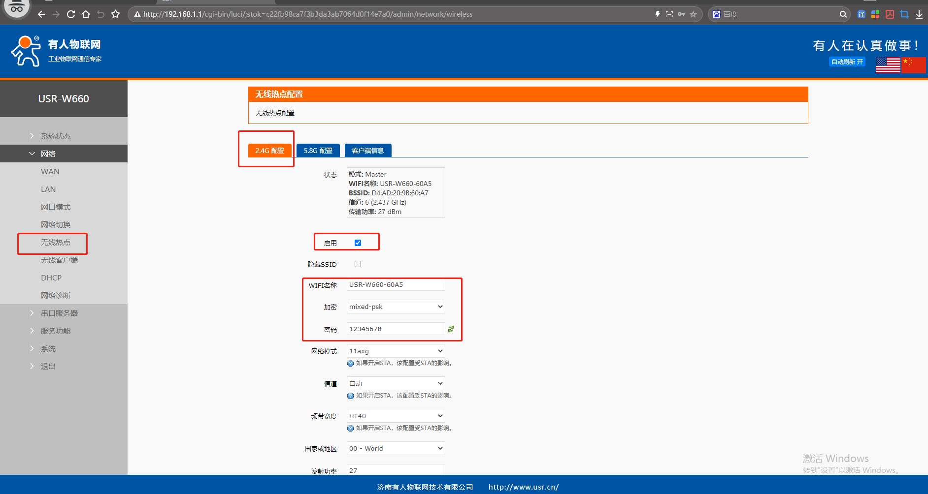 網(wǎng)頁(yè)點(diǎn)開(kāi)網(wǎng)絡(luò),點(diǎn)擊無(wú)線熱點(diǎn),點(diǎn)開(kāi)2.4G配置,勾選啟用,WIFI名稱(chēng)是USR-W660-60A5,加密選擇mixed-psk,密碼設(shè)置12345678。