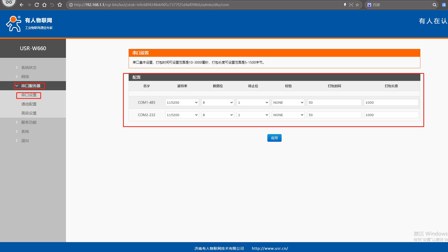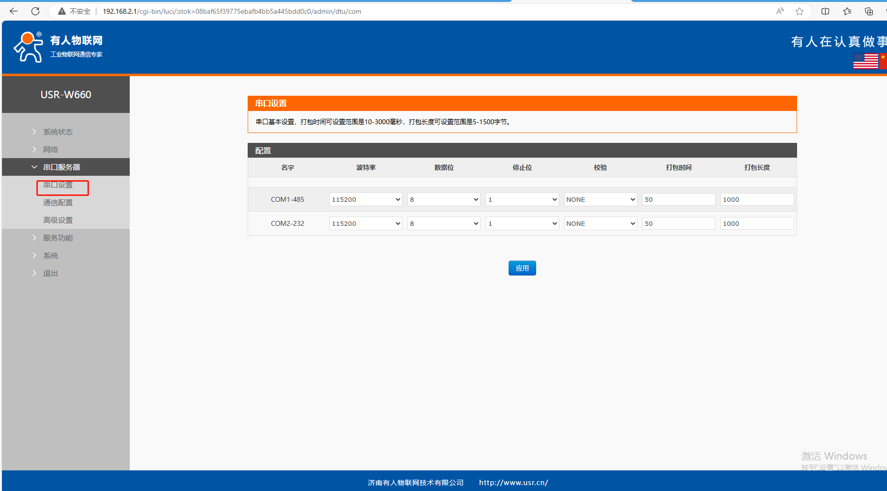 網(wǎng)頁(yè)點(diǎn)開(kāi)串口服務(wù)器,點(diǎn)擊串口設(shè)置,這里可以對(duì)USR-W660的485或者232串口參數(shù)進(jìn)行修改設(shè)置。本案例使用默認(rèn)波特率115200。