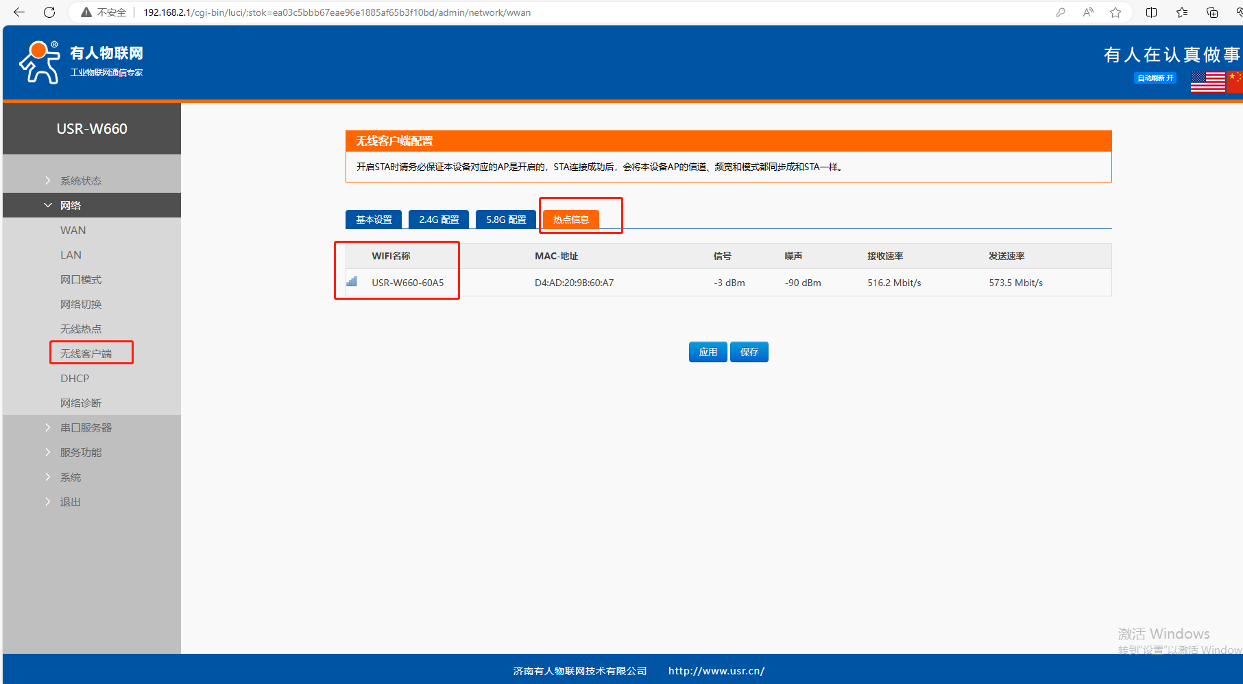 連接2號(hào)USR-W660的WiFi,瀏覽器輸入192.168.2.1,登陸網(wǎng)頁(yè),點(diǎn)開(kāi)網(wǎng)絡(luò),點(diǎn)擊無(wú)線客戶(hù)端,點(diǎn)擊熱點(diǎn)信息,可以查看連上AP的信息。