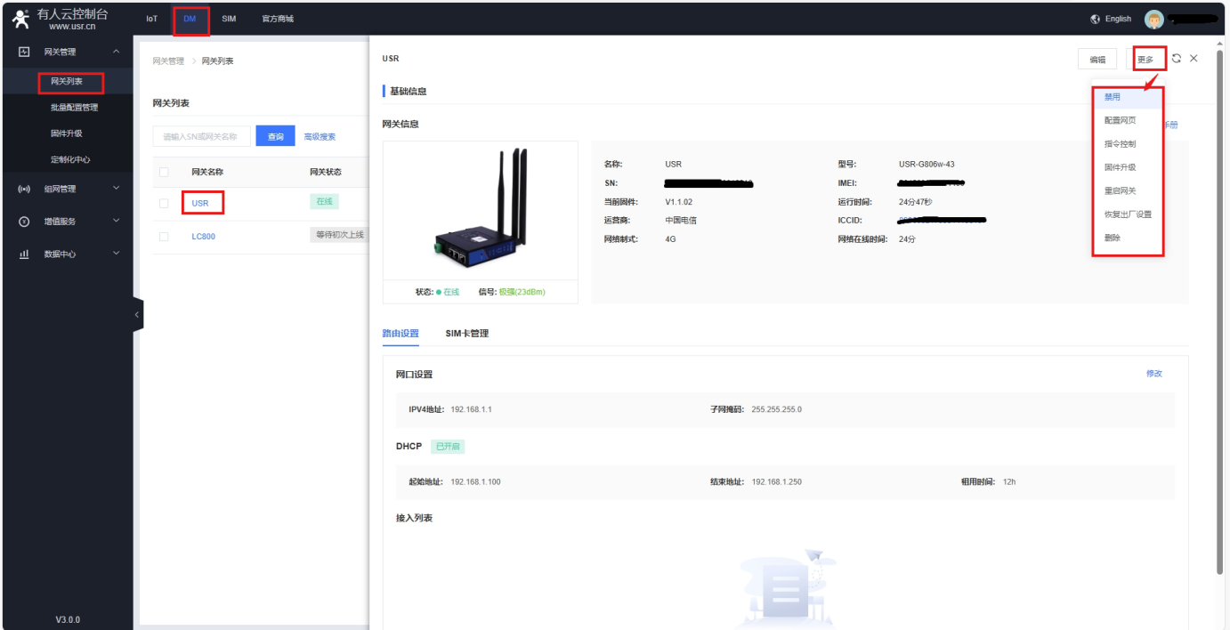 (1)點擊右上角的更多,可以對添加到有人云上的路由器,進行禁用、配置網關、指令控制、固件升級、重啟網關、恢復出廠設置、刪除等操作。