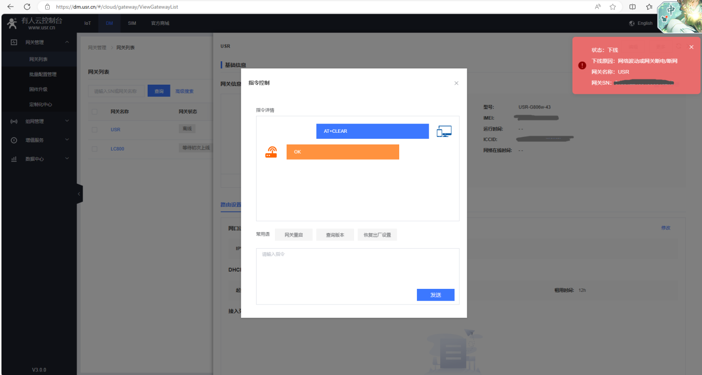 (2)在指令控制彈框,也可以發送AT指令,AT+CLEAR,去恢復出廠設置。