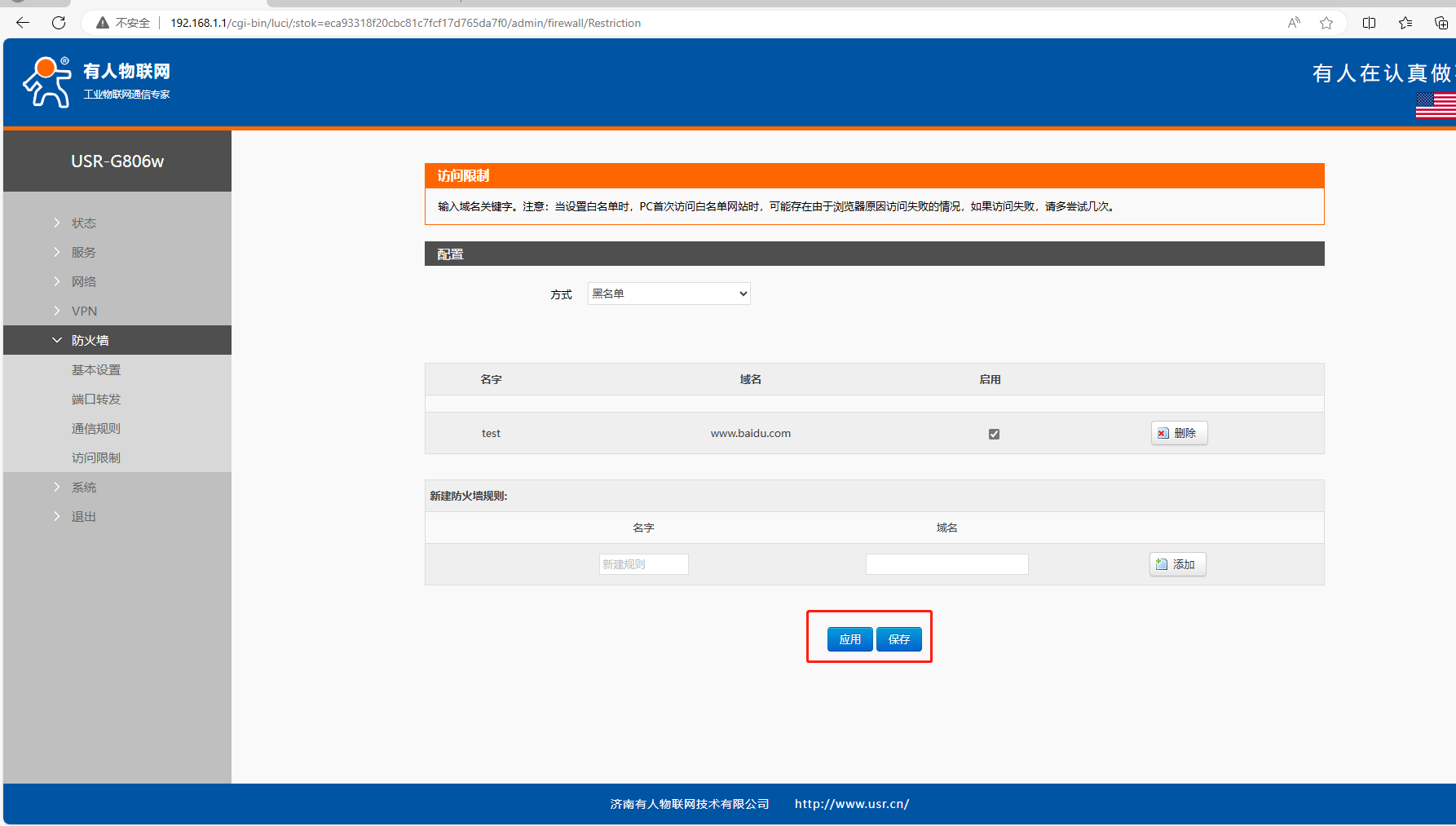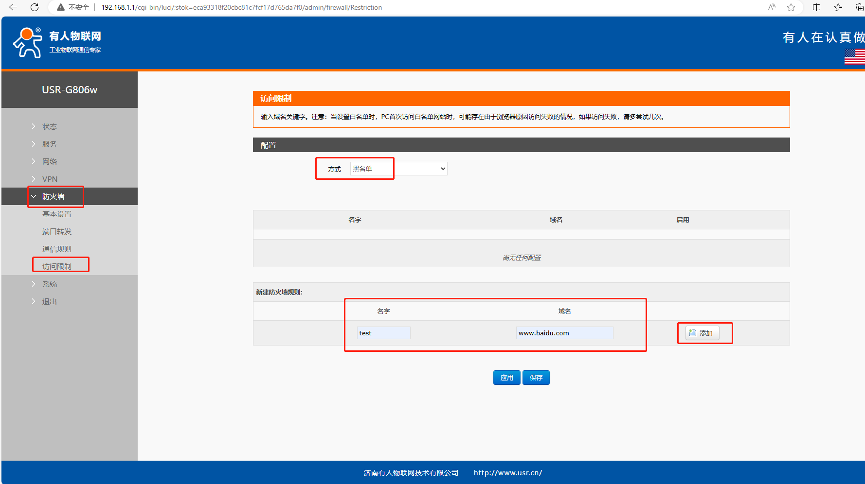 (1)網(wǎng)頁(yè)點(diǎn)擊防火墻,點(diǎn)擊訪(fǎng)問(wèn)限制,方式選擇黑名單,點(diǎn)擊添加輸入該條規(guī)則的名稱(chēng)和正確的域名,點(diǎn)擊添加。舉例:域名是使用www.baidu.com。