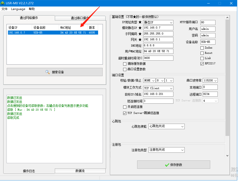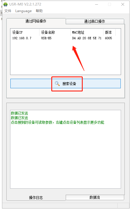 USR-K5和電腦網線直連,打開M0軟件,搜到USR-K5的IP。