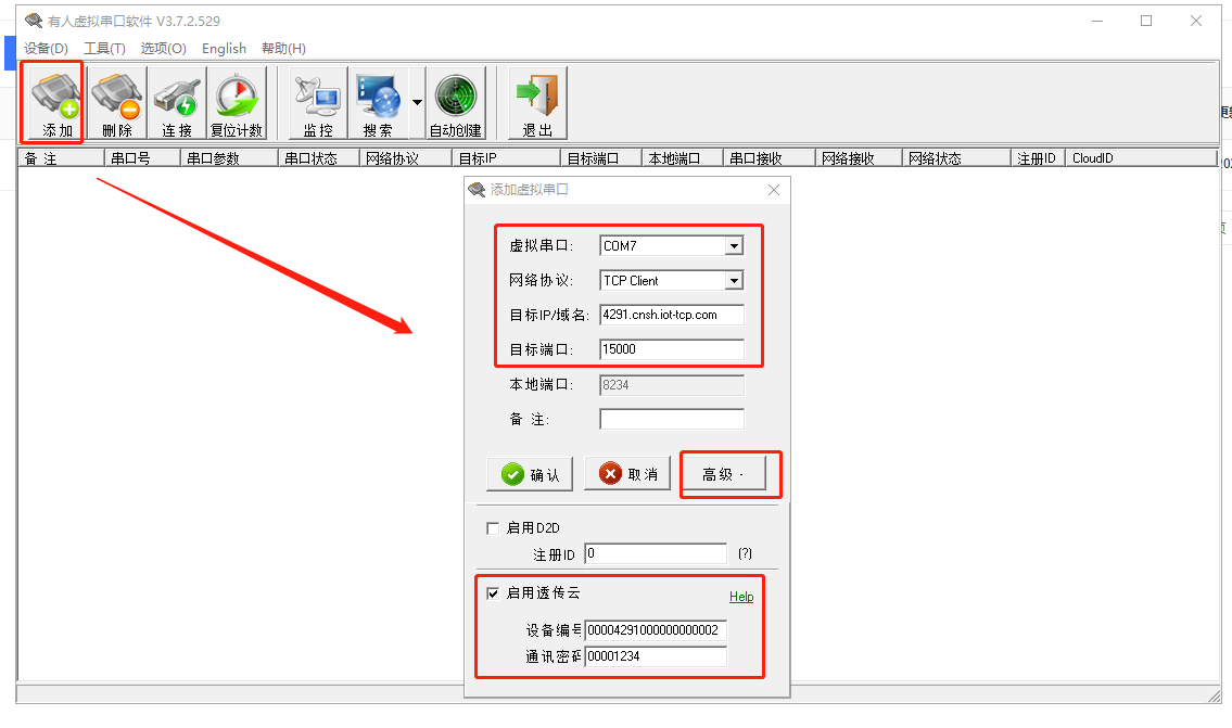 高級設置開啟透傳云,輸入有人云添加設備的編號ID00004291000000000002和密碼00001234,點擊確認。