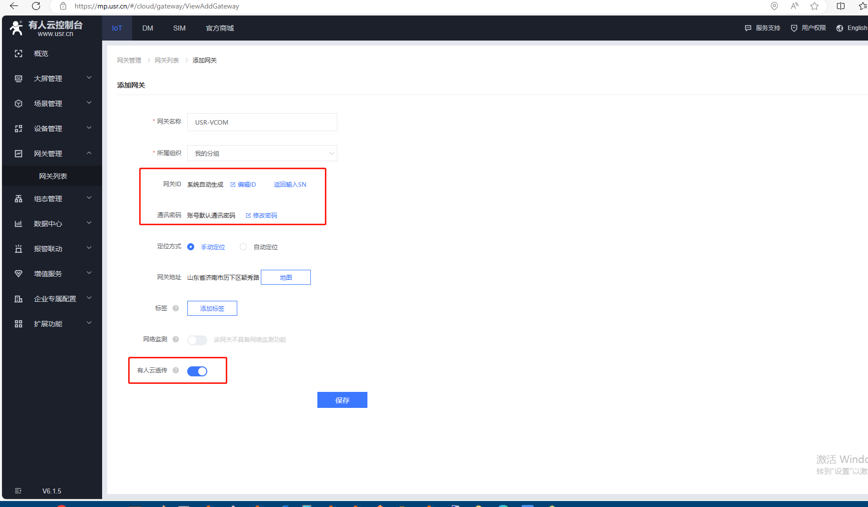 2、USR-VCOM虛擬串口添加,點擊SN不支持,點這里,用自動生成的ID方式上云,在有人云上添加設備,勾選有人云透傳。