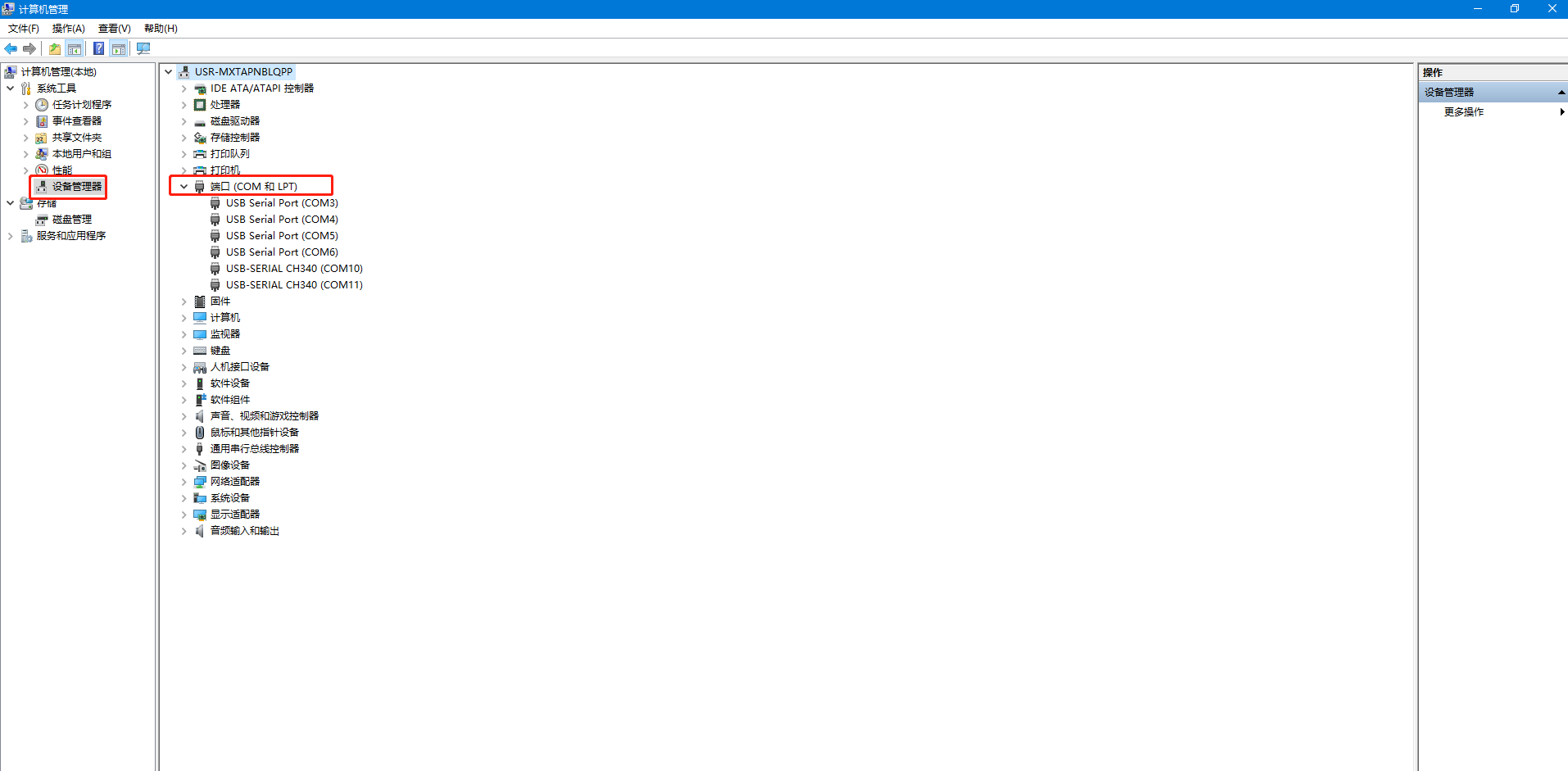 電腦鼠標點擊計算機管理,右擊,點開設備管理器,點擊端口,查看接USR-K7底板的USB-RS232串口線COM口號。