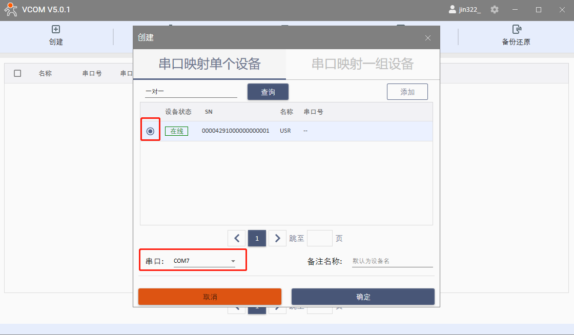 選擇串口映射單個設備,勾選在線的USR-K7,用空閑的COM7作為虛擬串口的COM口號,點擊確定。