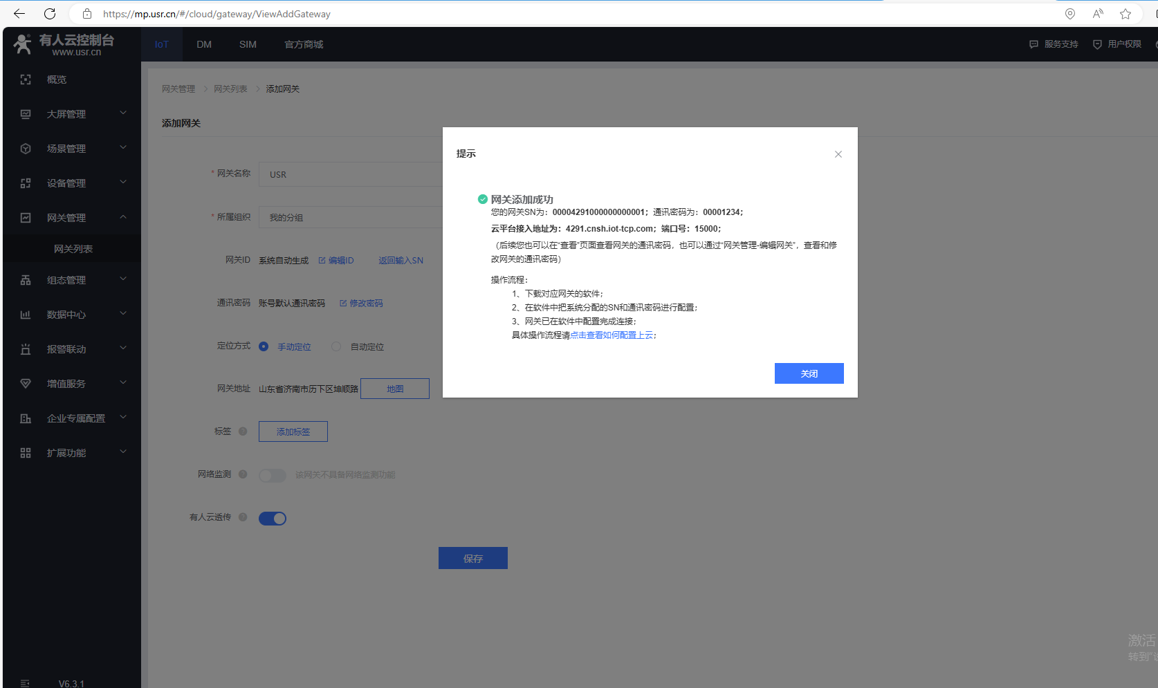 網關添加成功