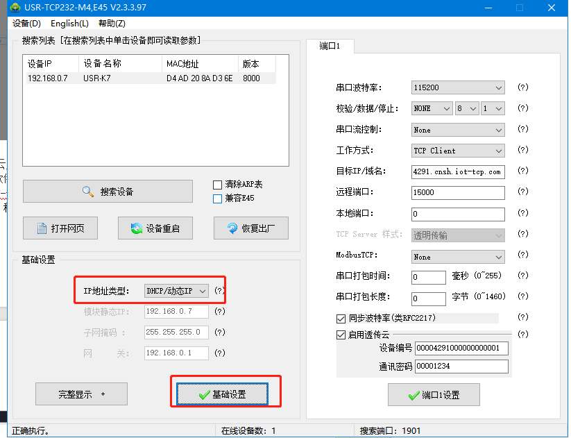 4、重新搜索USR-K7的IP,基礎設置,IP地址類型,將靜態IP改為DHCP,點擊基礎設置。設置完DHCP之后,USR-K7網線接可以上外網的路由器LAN口。