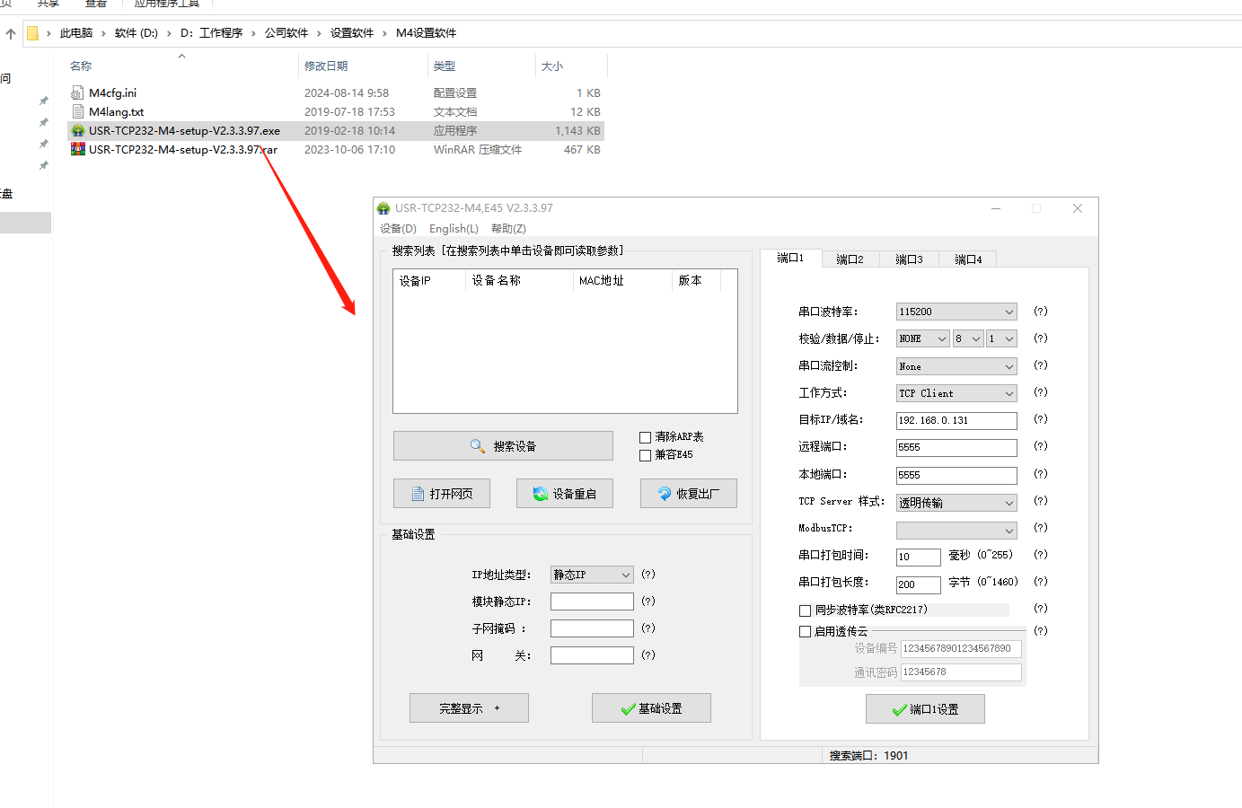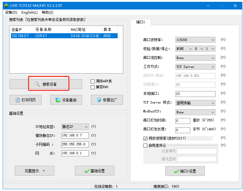 2、用M4設置軟件,點擊搜索,搜到USR-K7的IP。