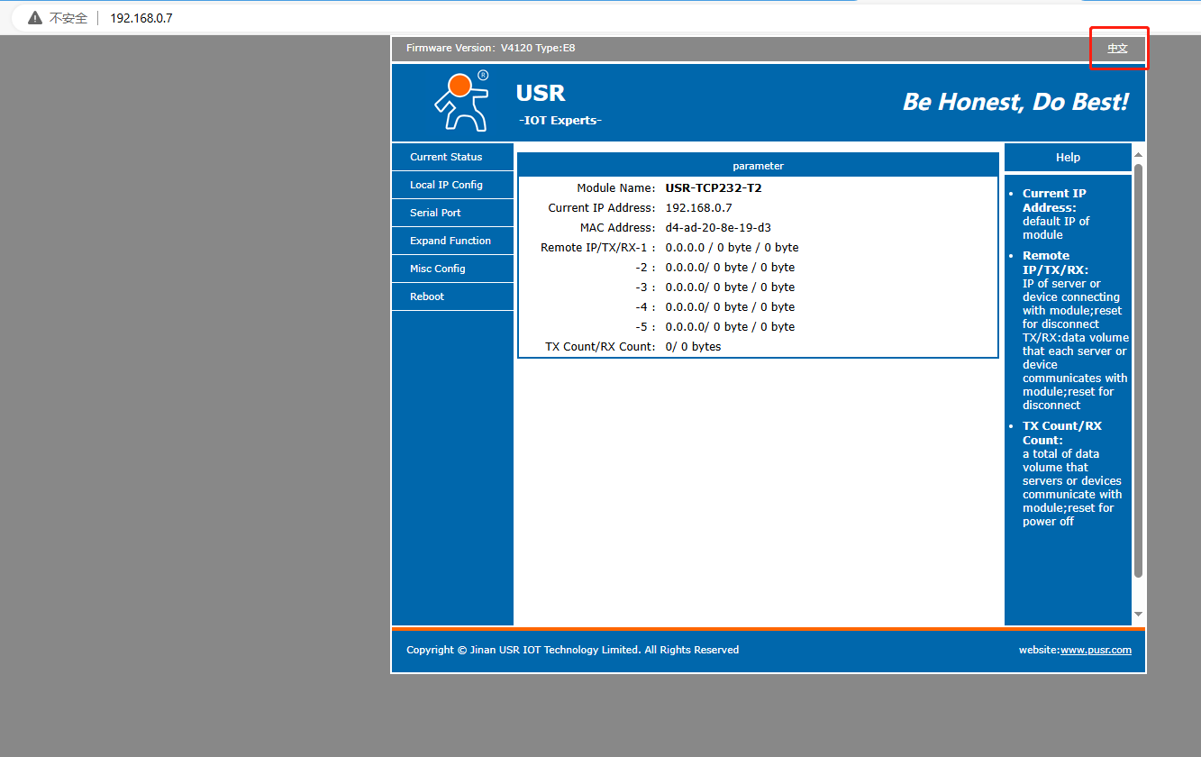 1、USR-TCP232-T2網(wǎng)線和電腦直連,IP同網(wǎng)段,瀏覽器輸入19.168.0.7登陸T2網(wǎng)頁,用戶名和密碼都是admin。