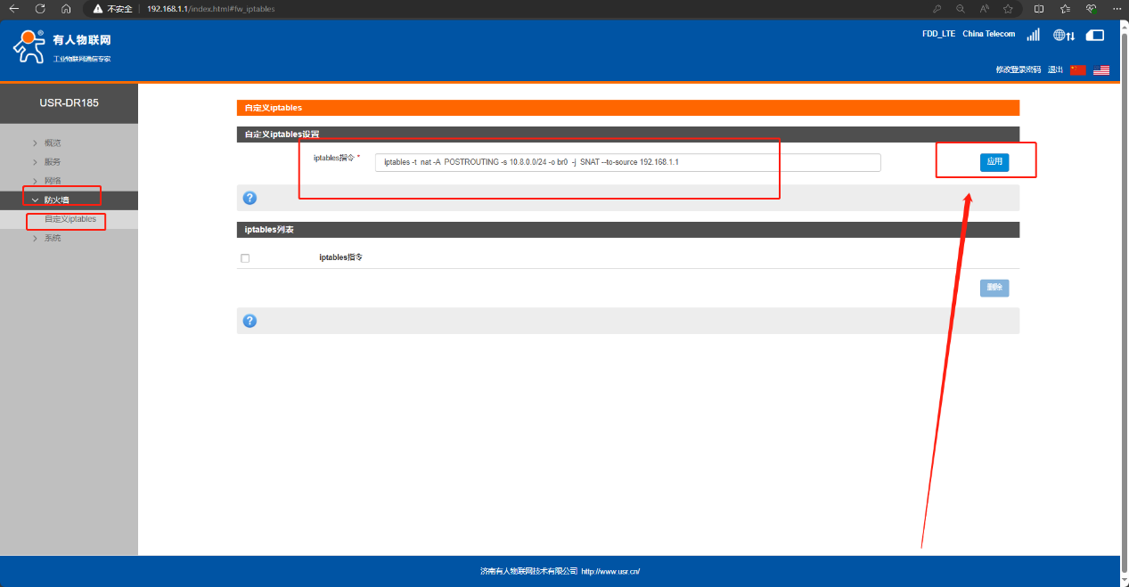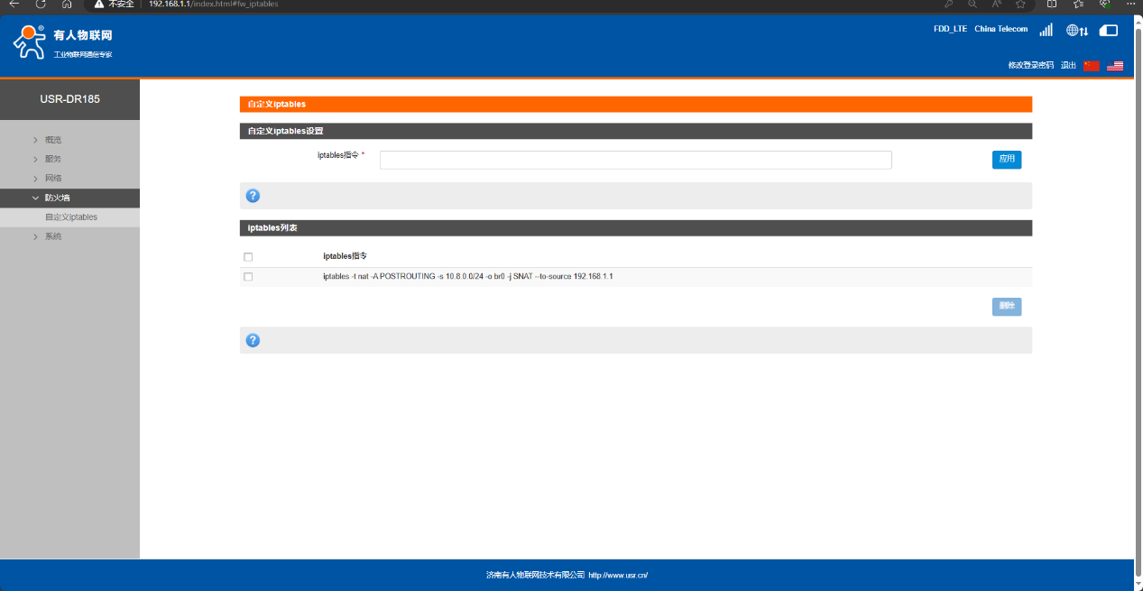 iptables是 Linux 系統中用于配置防火墻規則的命令行工具;-t nat:指定要操作的表是 nat 表,這個表用于網絡地址轉換;-A表示向指定的鏈添加規則。POSTROUTING 是 nat 表中的一個鏈,用于處理從本地網絡發出、即將離開主機的數據包;-s 選項指定了規則適用的源地址。這里 10.8.0.0/24 表示源地址范圍是 10.8.0.0 到 10.8.0.255,這是DM組網里給DR185分配的虛擬IP;-o 選項指定了數據包的輸出接口;br0 是輸出接口的名稱,表示所有從這個接口發出的數據包都將應用這條規則;-j 選項指定了規則匹配后要執行的動作。SNAT即Source NAT表示將執行源地址轉換;--to-source 192.168.1.1:指定了要轉換到的目標源 IP 地址,這里代表DR185的lan口IP。所有匹配規則的數據包的源 IP 地址將被替換為 192.168.1.1。