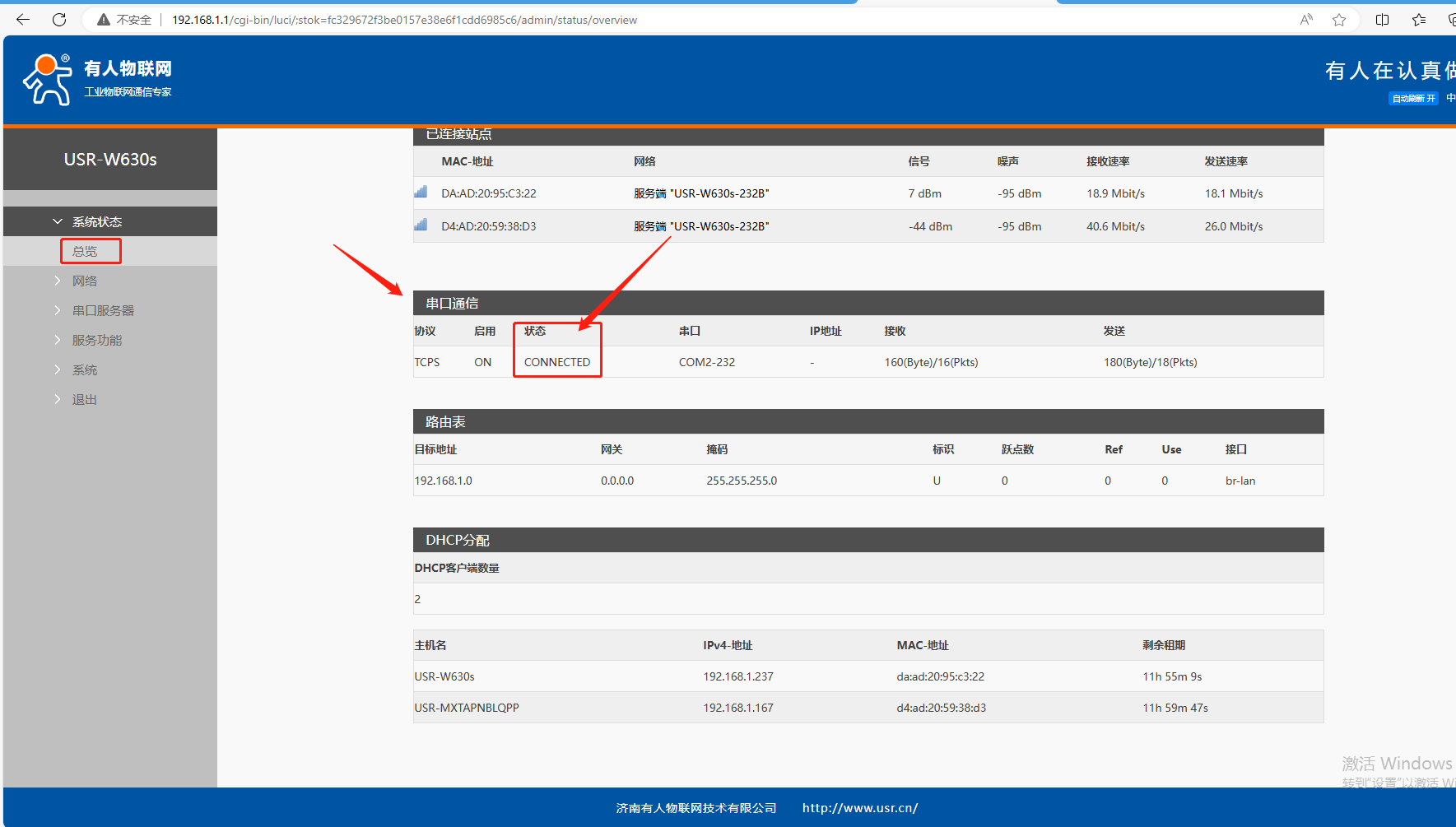 4、USR-W630s AP網(wǎng)頁總覽,可以查看TCP連接狀態(tài)