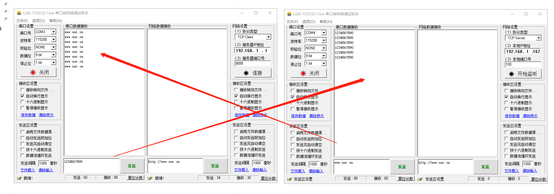 1、打開2個(gè)串口助手,串口參數(shù)設(shè)置和2個(gè)USR-W630s 232串口參數(shù)一致。115200,NONE,8,1