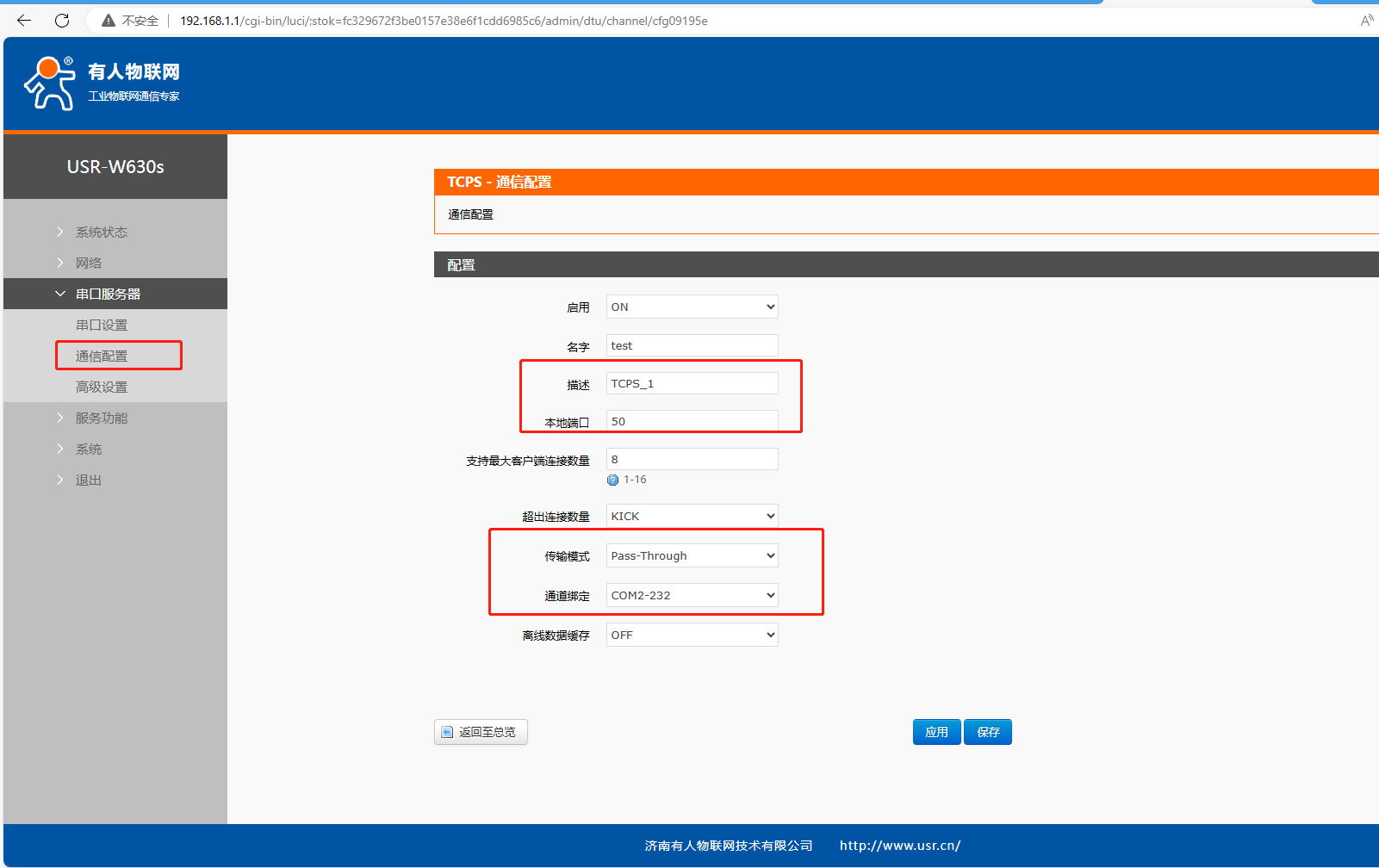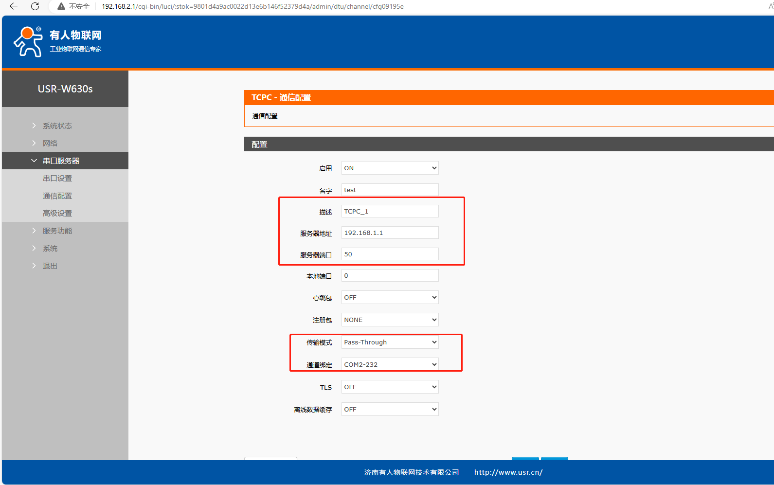 服務(wù)器地址填連接AP的IP:192.168.1.1,服務(wù)器端口:50,傳輸模式:Pass-Through,通道綁定:COM2-232。