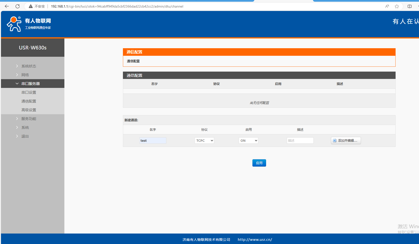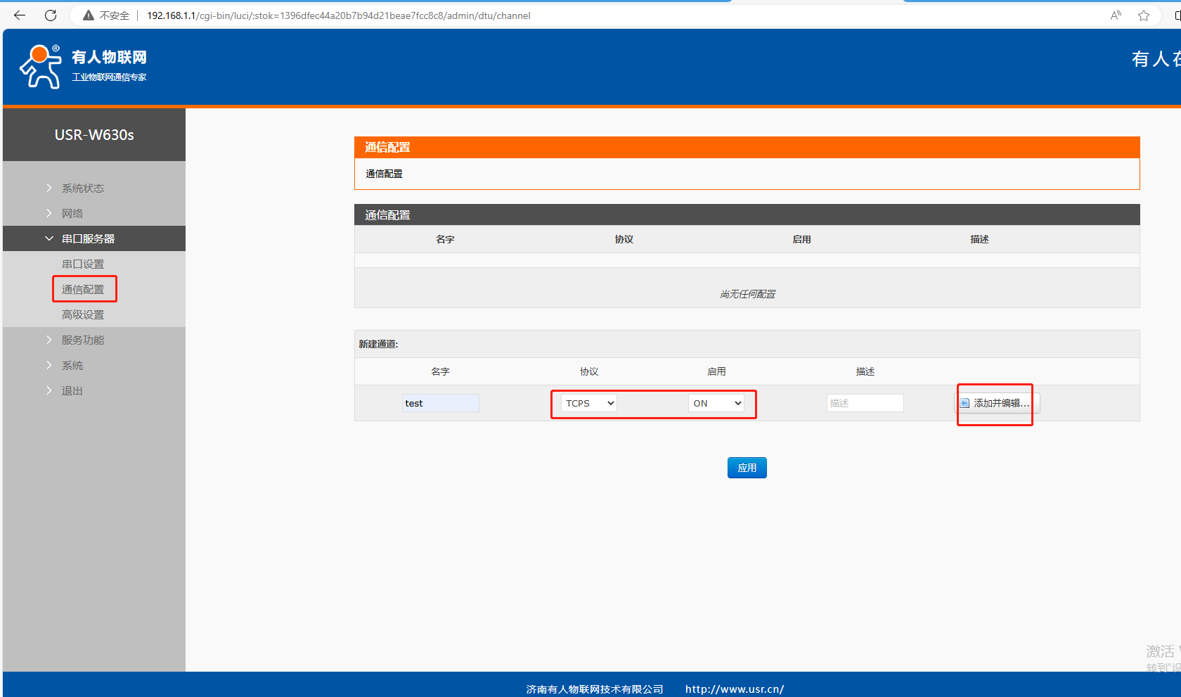 (5)串口服務(wù)器,通信配置,協(xié)議TCPS,應(yīng)用ON,點(diǎn)擊添加并編輯。