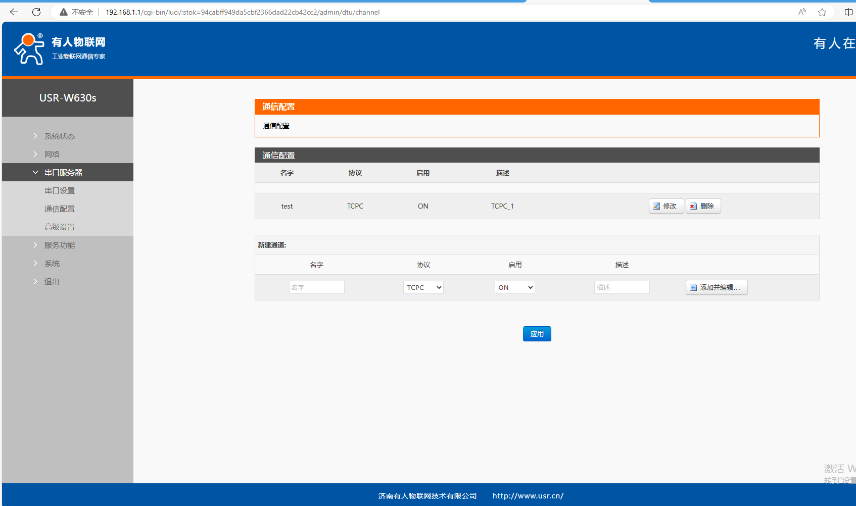 (5)串口服務(wù)器,通信配置,協(xié)議TCPC,應(yīng)用ON,點(diǎn)擊添加并編輯。