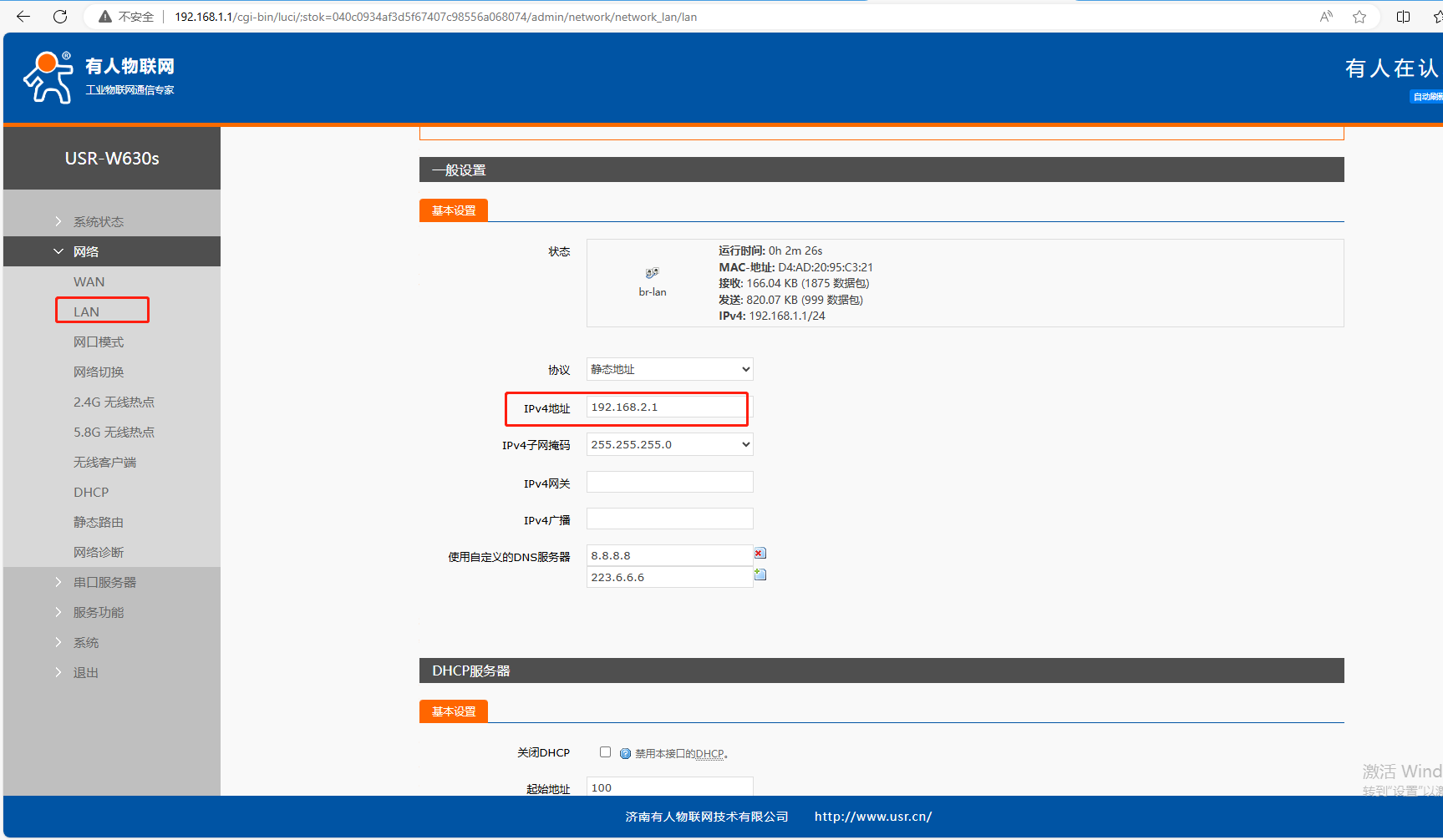 (6)網(wǎng)絡(luò),LAN,點(diǎn)擊修改,IPv4地址192.168.1.1,要改為和做AP的USR-W630s不一樣的網(wǎng)段IP。這里改為192.168.2.1,點(diǎn)擊應(yīng)用。