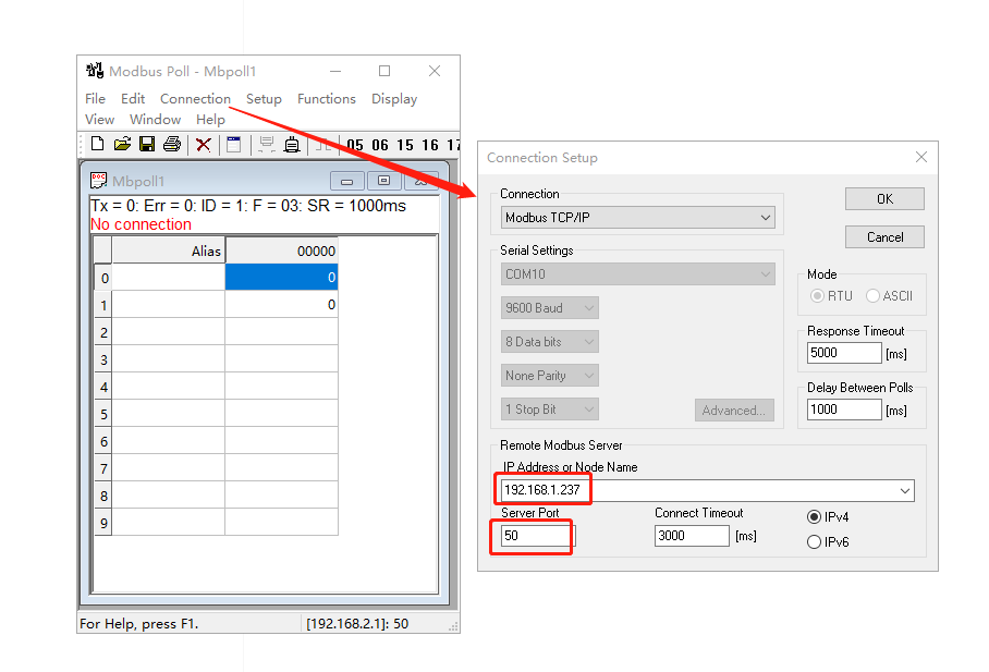 4、打開MODBUS POLL軟件,點擊Connection,做MODBUS TCP連接USR-W630s 的IP:192.168.1.237和端口號:50。點擊OK。