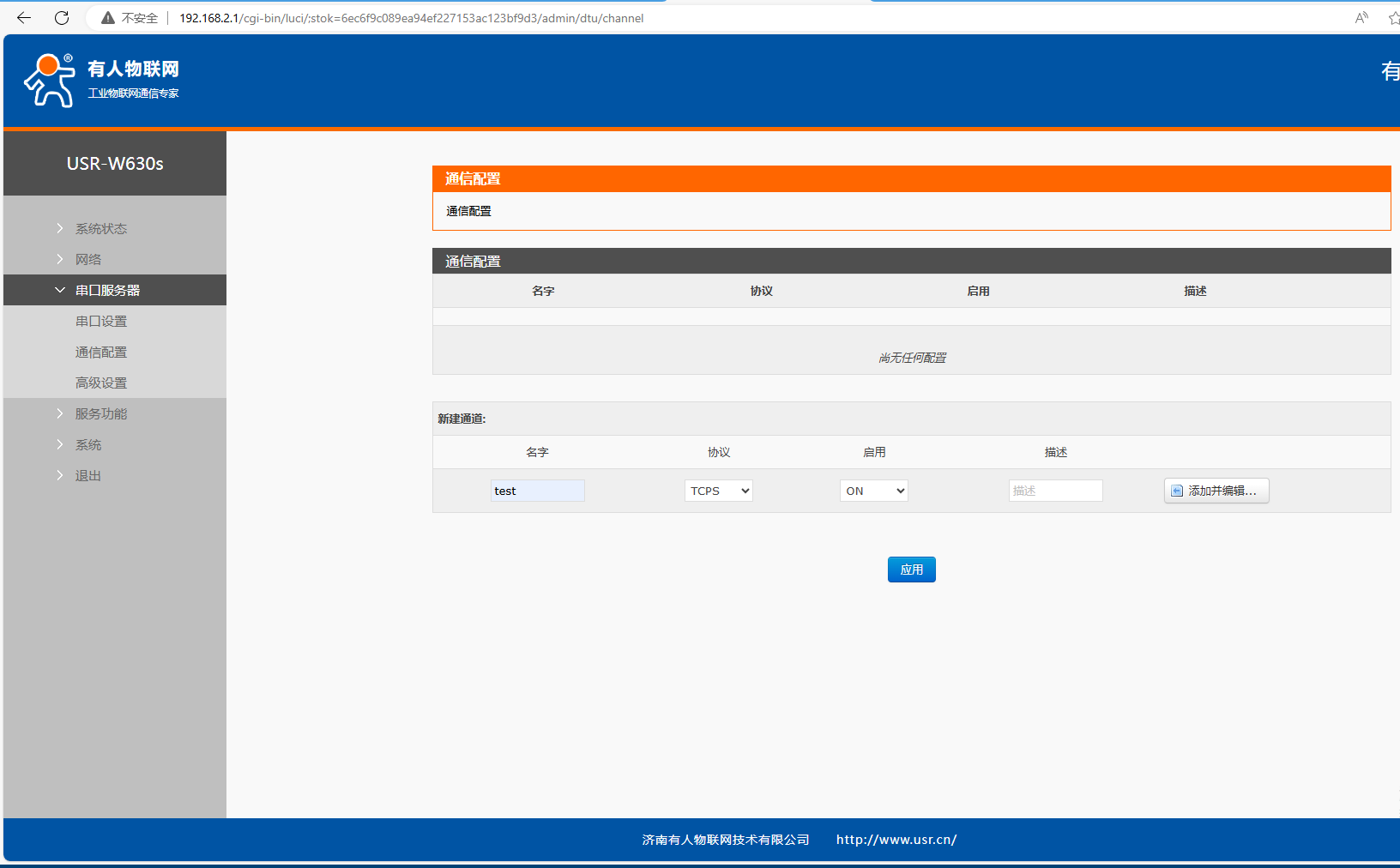 (5)串口服務(wù)器,通信配置,協(xié)議TCPS,應(yīng)用ON,點擊添加并編輯。