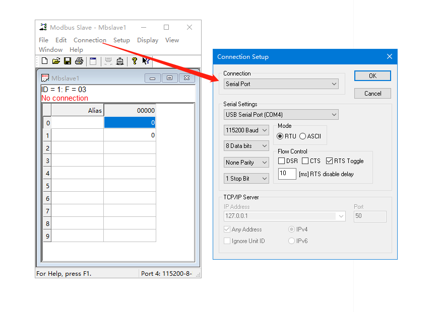 2、打開MODBUS SLAVE軟件,點擊Connection,選擇USR-W630s的USB-RS232串口線COM口號COM4,打開串口,MODBUS SLAVE軟件的串口參數(shù)設(shè)置和USR-W630s的串口參數(shù)一致。點擊OK。