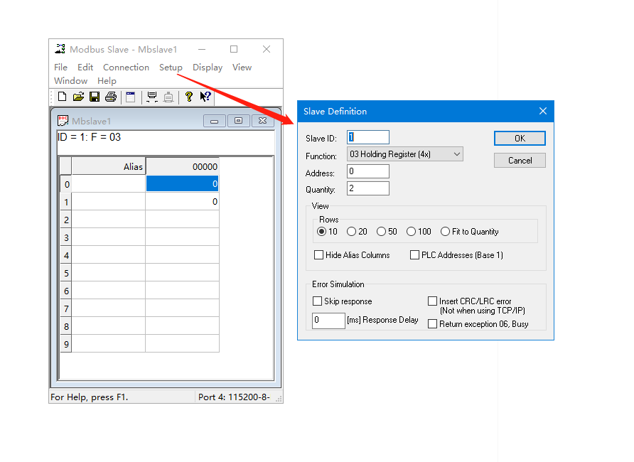 1、打開MODBUS SLAVE軟件,點擊Setup,從機地址Slave ID 用1,寄存器功能碼Function 用03,寄存器起始地址Address 用0,寄存器數(shù)量Quantity 用2。