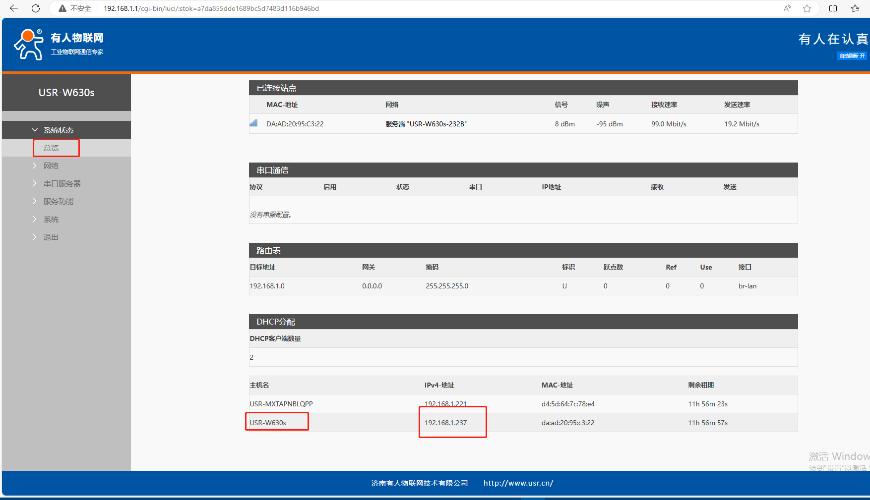 4、登陸AP的USR-W630s網(wǎng)頁,查看AP分配給STA的IP 是192.168.1.237,和AP網(wǎng)口下的電腦IP同網(wǎng)段,電腦和STA的USR-W630s可以建立MOBDUS TCP通訊。