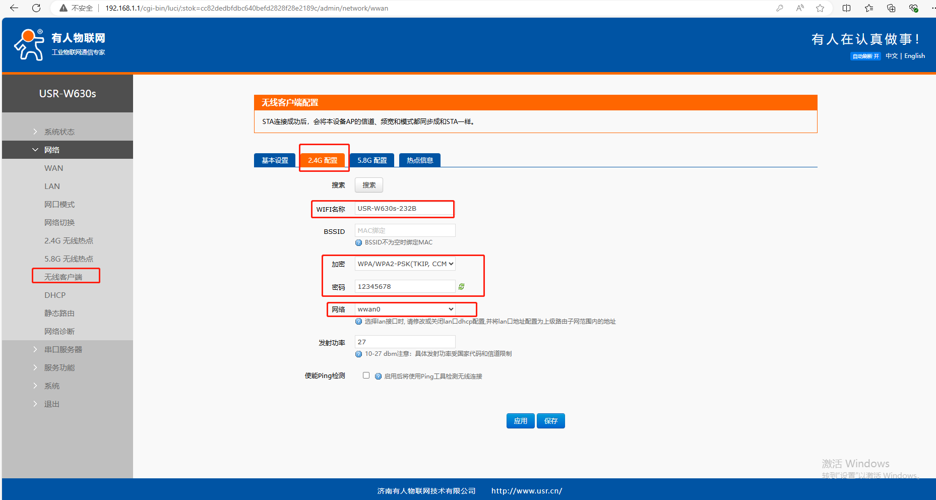 (1)連接USR-W630s 2.4GHZ WiFi,USR-W630s-232B