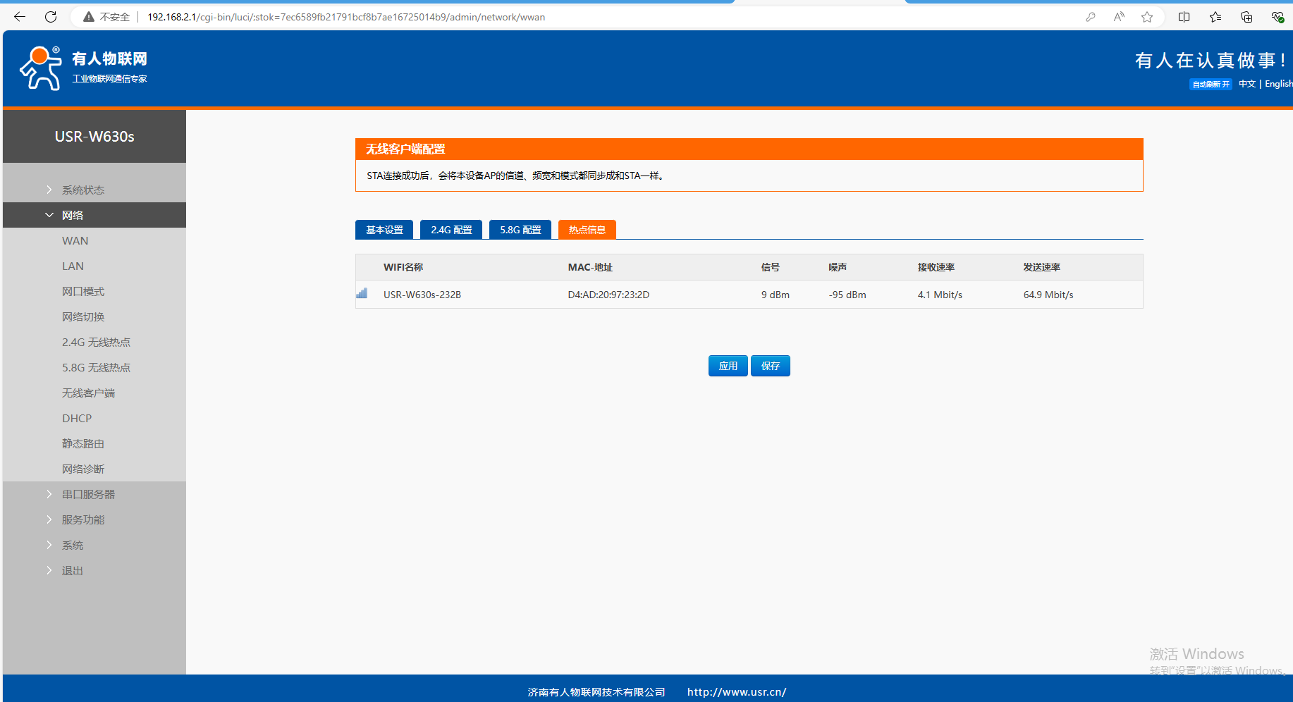 3、USR-W630s STA網(wǎng)頁,無線客戶端,熱點信息可以查看無線連接狀態(tài),連接AP之后,顯示AP熱點信息。