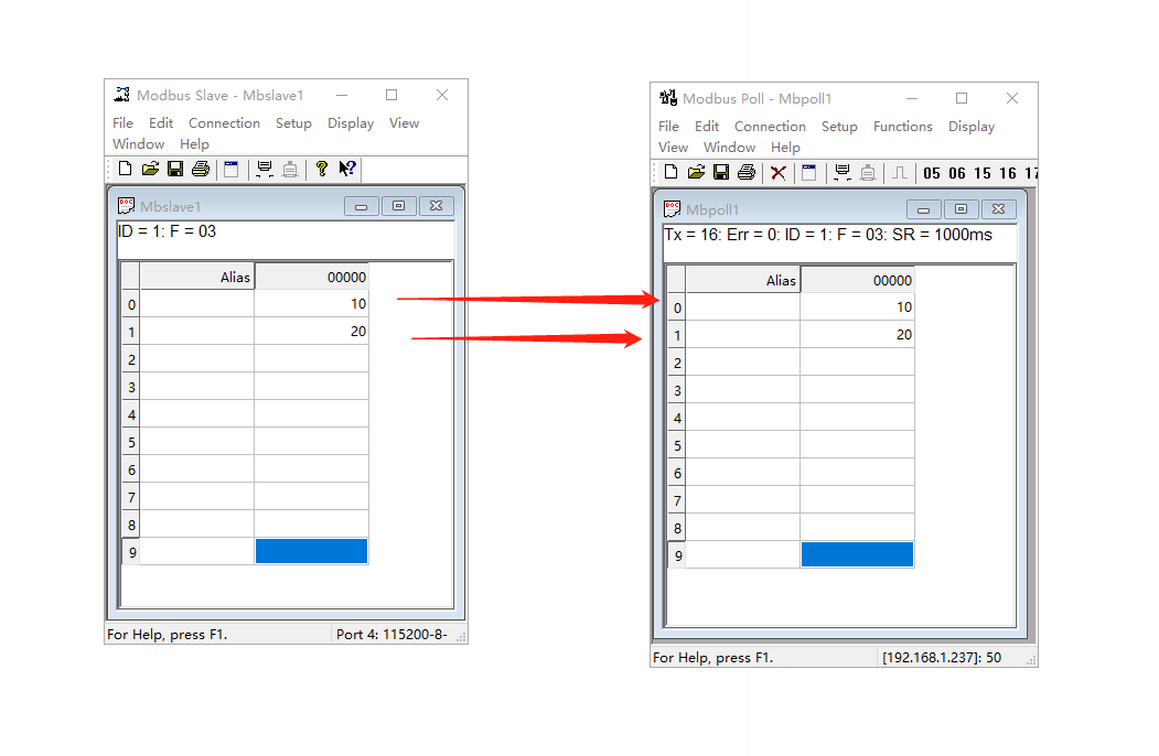 4、建立連接之后,改變MODBUS SLAVE的數(shù)據(jù),MODBUS POLL對應(yīng)讀取出數(shù)據(jù)。