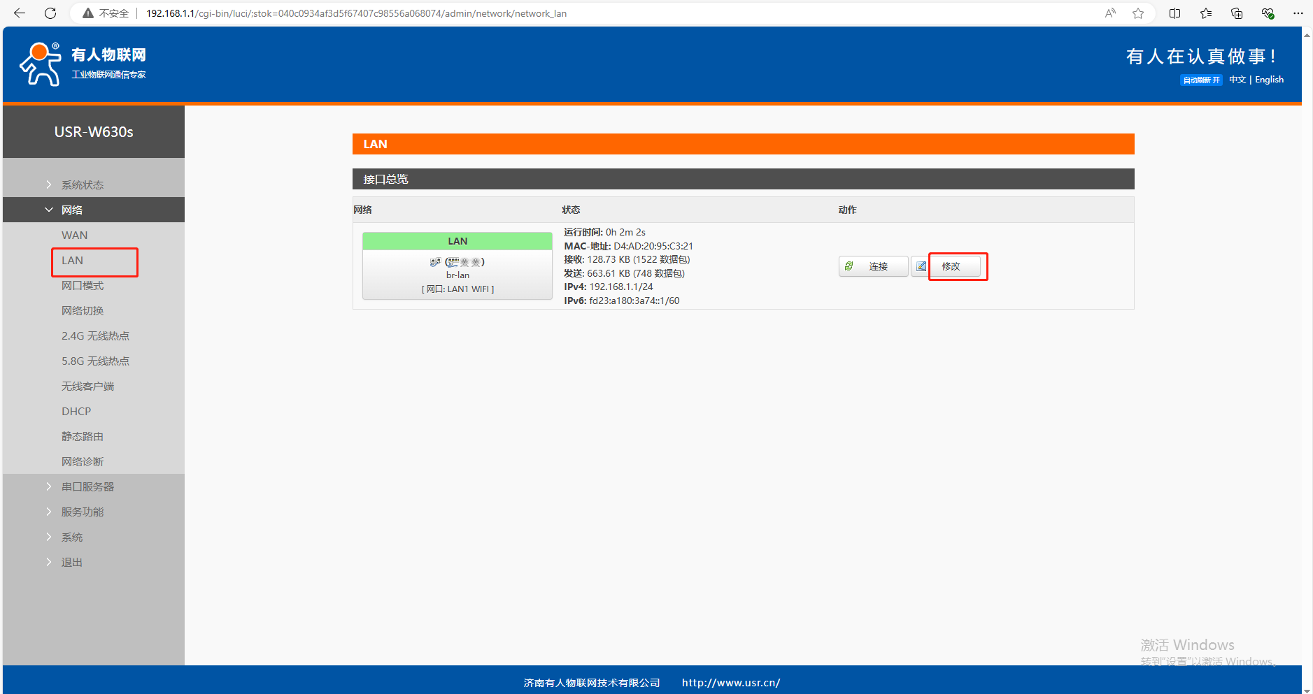 (6)網(wǎng)絡(luò),LAN,點擊修改,IPv4地址192.168.1.1,要改為和做AP的USR-W630s不一樣的網(wǎng)段IP。這里改為192.168.2.1,點擊應(yīng)用。