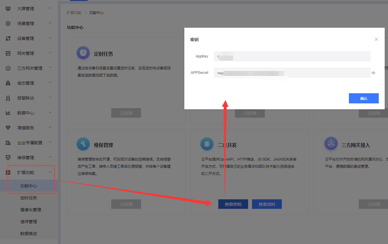 A、申請二次開發權限后,可在擴展功能-功能中心中查看密鑰