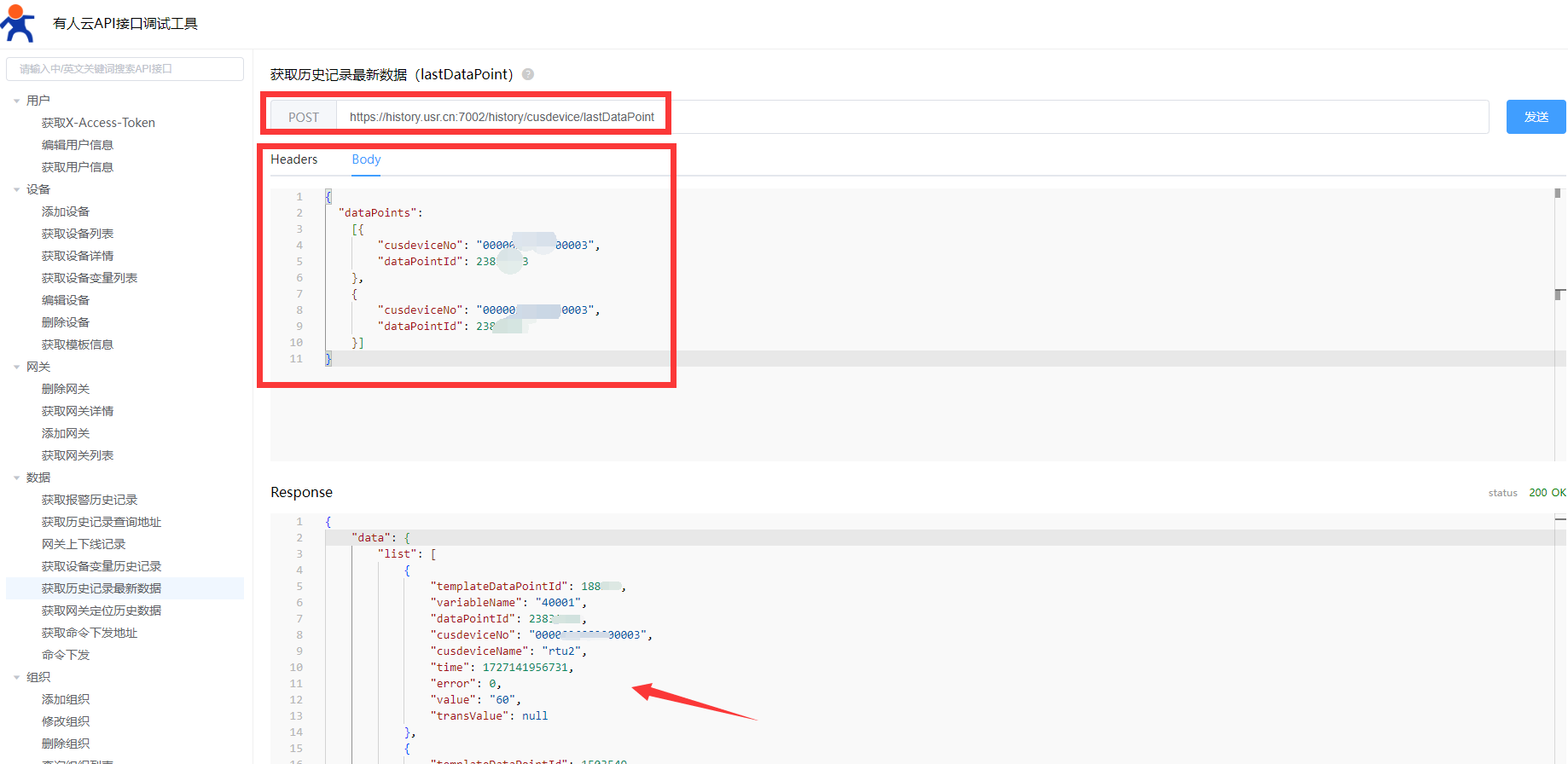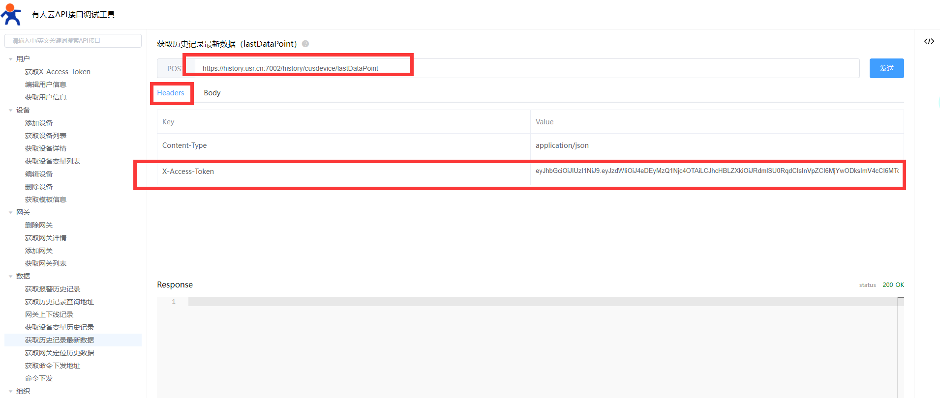 A、將{url}/history/cusdevice/lastDataPoint中{url}的替換為前一步獲取的查詢地址,組成獲取歷史記錄最新數據的URL:https://history.usr......./history/cusdevice/lastDataPoint