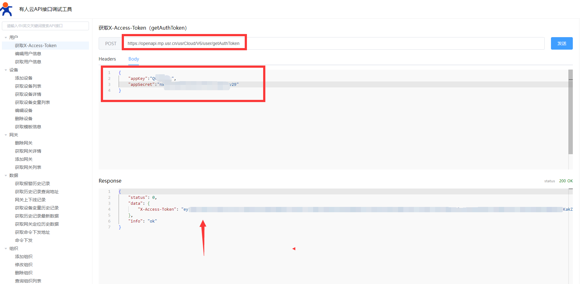 B、打開調試工具,將獲取X-Access-Token的接口URL跟body請求復制進工具相應位置,將具體參數替換成前一步獲取的密鑰,填寫完成后發送,可獲取到token