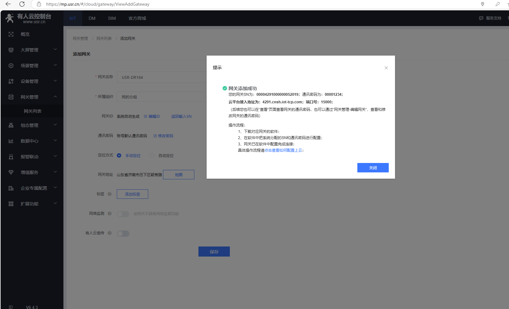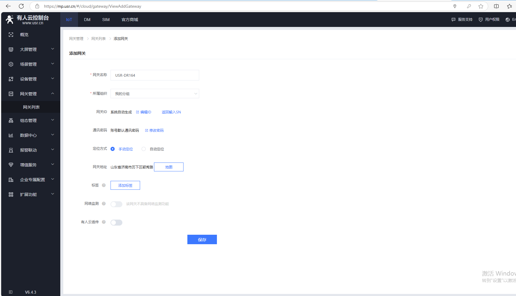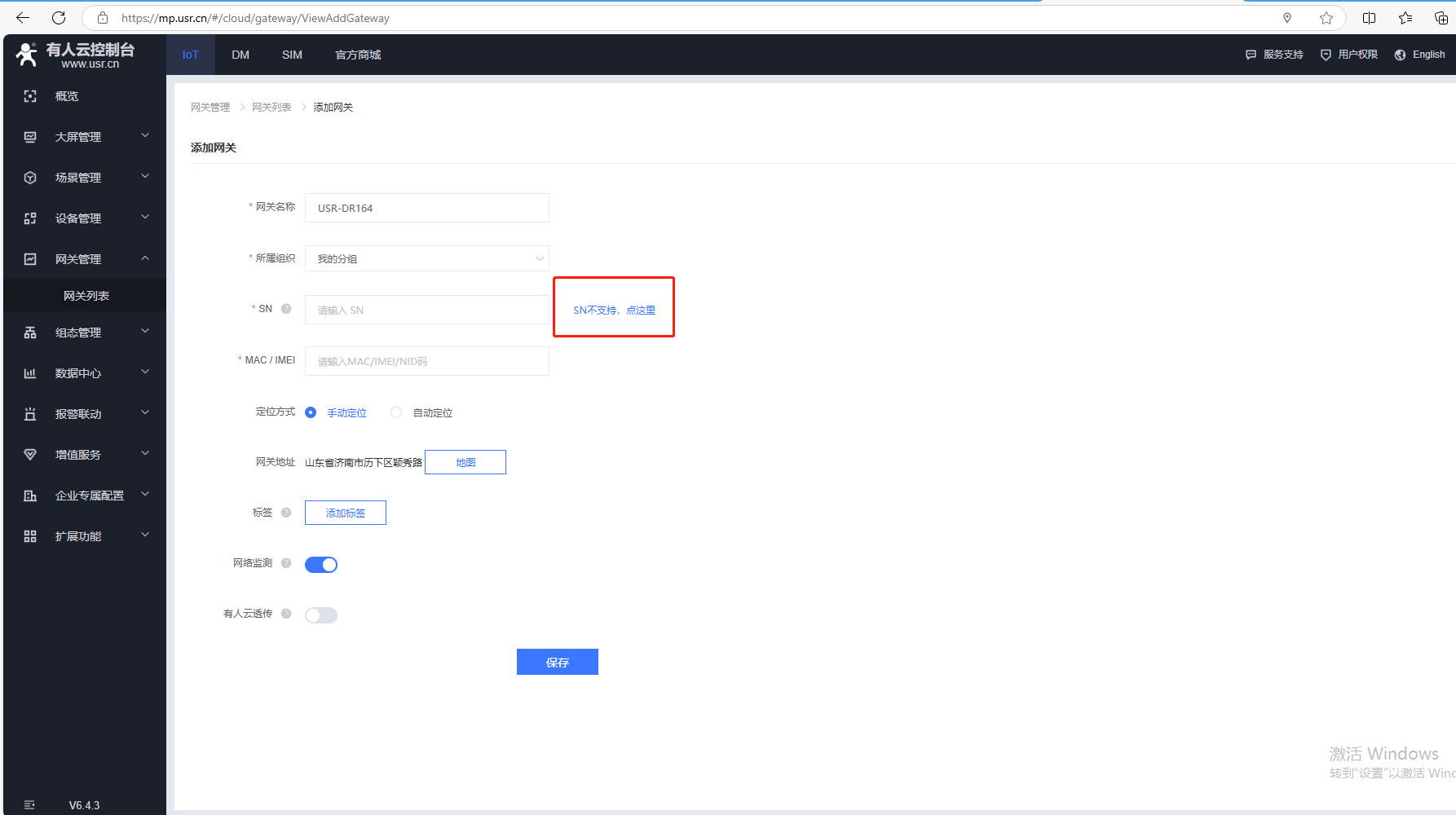 (2)USR-DR164不支持SN添加有人云的產(chǎn)品,在有人云添加網(wǎng)關(guān)的時候,點擊SN不支持點這里,自動生成ID和密碼,有人云透傳需要關(guān)閉,最后點擊保存。