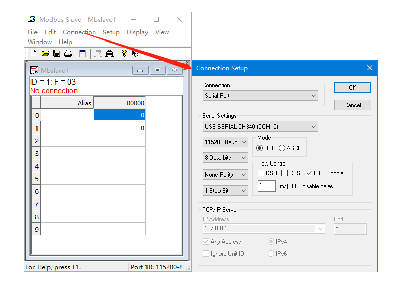 (2)點擊Connection,選擇串口,對應(yīng)USR-DR164所接USB-RS485串口線的COM口號,串口參數(shù)和USR-DR164串口參數(shù)保持一致。 Mode選擇RTU,模擬MODBUS RTU協(xié)議串口。