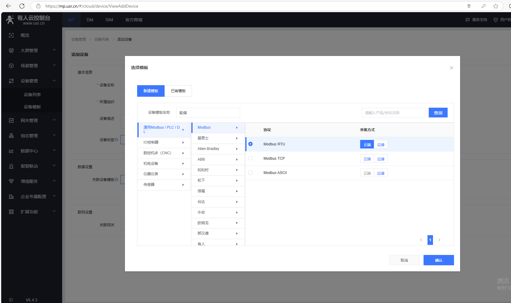 選擇新建模板,輸入設(shè)備模板名稱,通用Modbus/PLC/DL,選擇Modbus,協(xié)議選擇Modbus Rtu,采集方式云端,最后確認(rèn)。