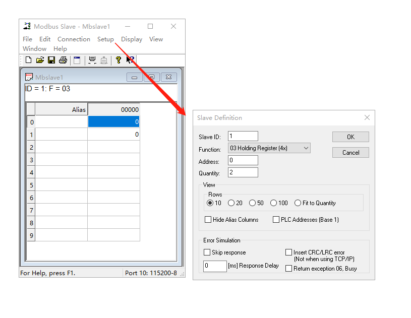 (1)點擊Setup,Slave ID從機(jī)地址用1,F(xiàn)unction功能碼用03,Address寄存器起始地址用0,Quantity寄存器地址數(shù)量用2。